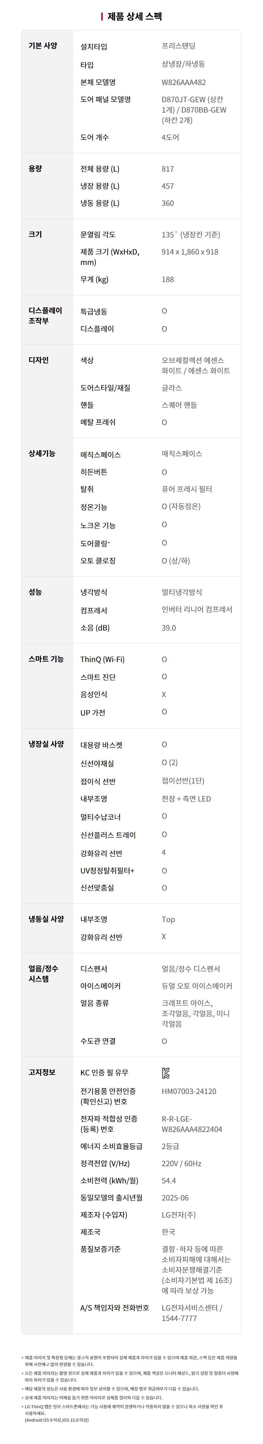 W826GQQ482S LG전자구독 [LG] 디오스 AI 오브제컬렉션 노크온 매직스페이스 얼음정수기냉장고 817L 에센스화이트 제품분류 냉장고 용량(총량) 800L이상 기능 얼음정수기 기능 5도어 AS기간 렌탈기간내 최저 렌탈가 월 124,900 (렌탈가) 제휴카드 할인가 월 (렌탈가) 3년 4년 5년 6년 라이트 서비스 프리미엄 서비스 할인 제휴카드 보기 렌탈신청 장바구니