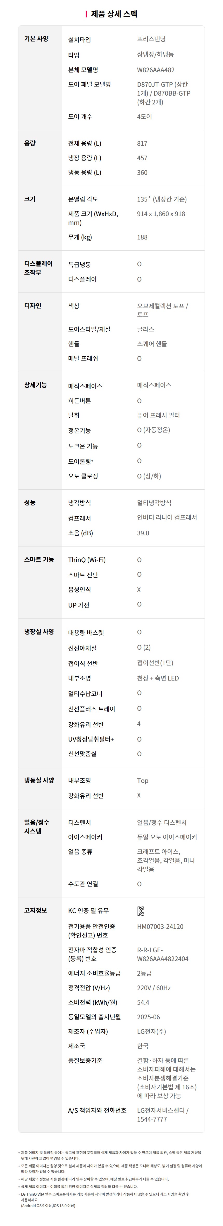 W826GGG482S LG전자구독 [LG] 디오스 AI 오브제컬렉션 노크온 매직스페이스 얼음정수기냉장고 817L 토프 제품분류 냉장고 용량(총량) 800L이상 기능 얼음정수기 기능 5도어 AS기간 렌탈기간내 최저 렌탈가 월 124,900 (렌탈가) 제휴카드 할인가 월 (렌탈가) 3년 4년 5년 6년 라이트 서비스 프리미엄 서비스 할인 제휴카드 보기 렌탈신청 장바구니