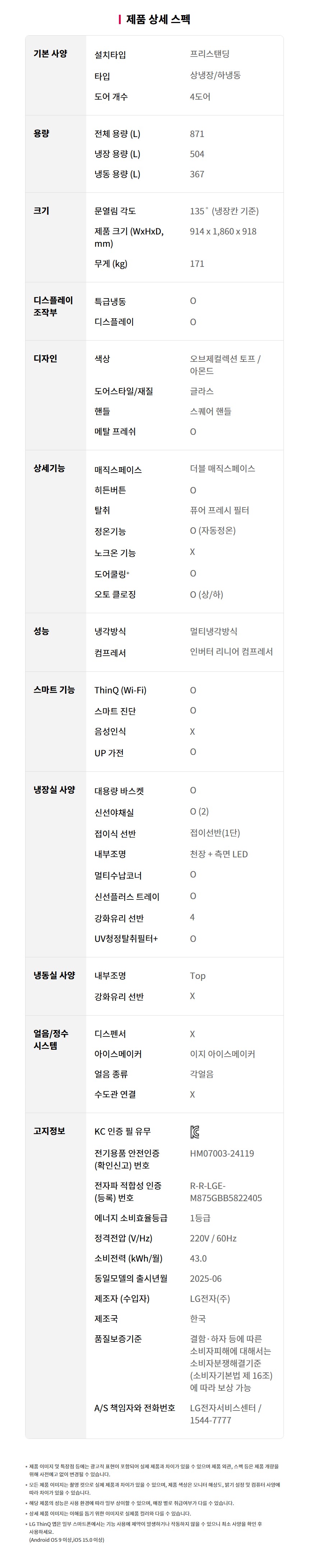 M876GGA231 LG전자구독 [LG] 디오스 AI 오브제컬렉션 더블매직스페이스 냉장고 871L 토프/아몬드 제품분류 냉장고 용량(총량) 800L이상 기능 6도어 AS기간 렌탈기간내 최저 렌탈가 월 82,900 (렌탈가) 제휴카드 할인가 월 (렌탈가) 3년 4년 5년 6년 라이트 서비스 프리미엄 서비스 할인 제휴카드 보기 렌탈신청 장바구니