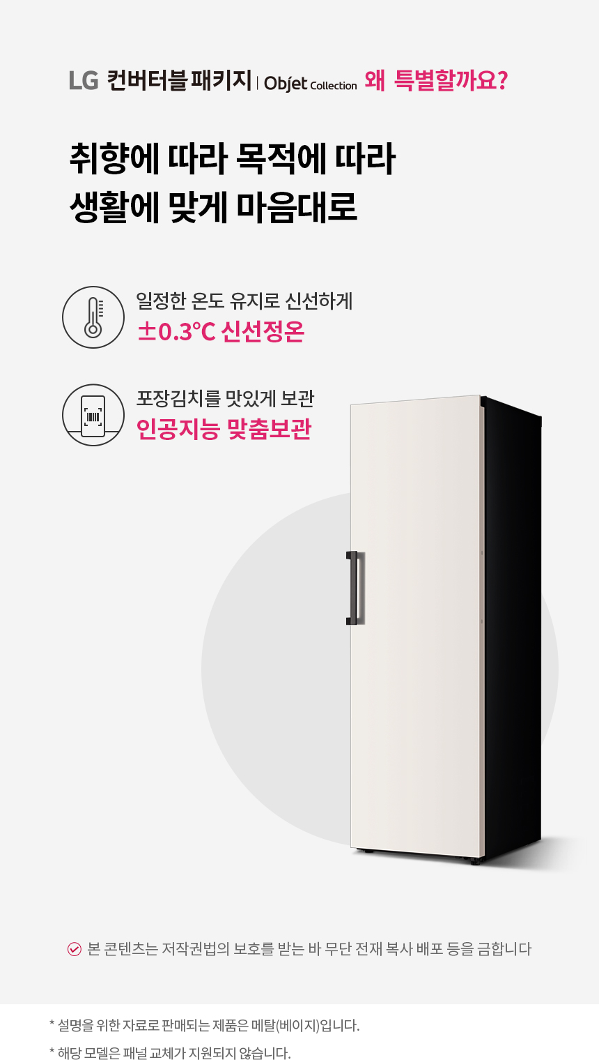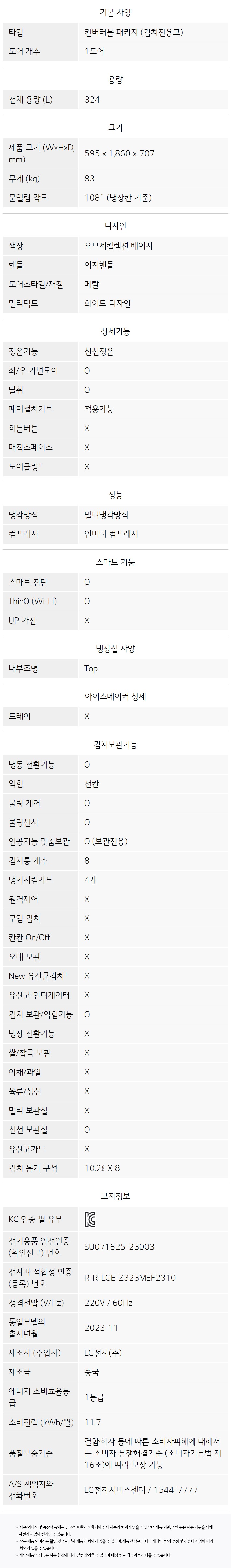 Z323MEF LG전자구독 [LG] 컨버터블 패키지 오브제컬렉션 김치냉장고 324L 베이지 제품분류 김치냉장고 용량(총량) 300L이상 기능 1도어 AS기간 렌탈기간내 최저 렌탈가 월 29,900 (렌탈가) 제휴카드 할인가 월 (렌탈가) 3년 4년 5년 6년 할인 제휴카드 보기 렌탈신청 장바구니