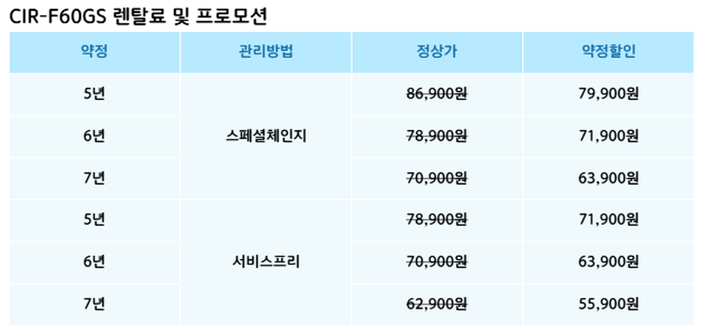 CIR-F60GS 코웨이 [코웨이] 노블 인덕션 100% All-Free 900mm 와이드 (전기공사형) 제품분류 전기레인지 기능 인덕션 AS기간 렌탈기간내 이벤트 7천원할인 최저 렌탈가 월 55,900 (렌탈가) 제휴카드 할인가 월 (렌탈가) 5년 6년 7년 서비스프리 스페셜체인지 할인 제휴카드 보기 렌탈신청 장바구니