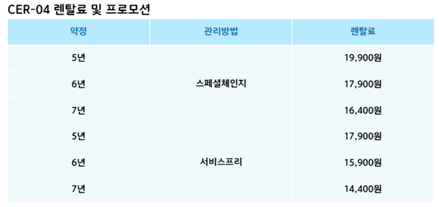 CER-04 코웨이 [코웨이] 프라임S 하이라이트 제품분류 전기레인지 기능 하이라이트 AS기간 렌탈기간내 최저 렌탈가 월 14,400 (렌탈가) 제휴카드 할인가 월 (렌탈가) 5년 6년 7년 서비스프리 스페셜체인지 할인 제휴카드 보기 렌탈신청 장바구니