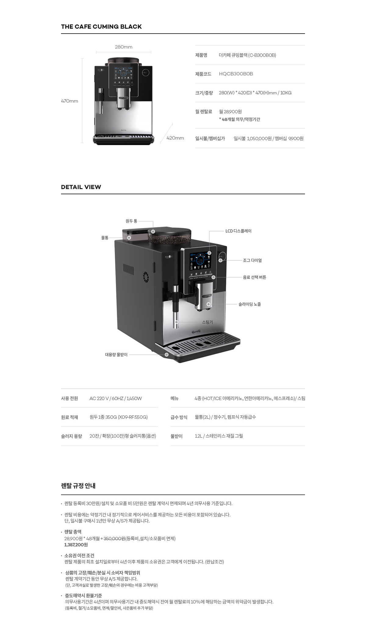C-B300B0B 현대큐밍 [현대큐밍] 더카페 커피머신 큐밍블랙 제품분류 커피머신 AS기간 렌탈기간내 최저 렌탈가 월 29,900 (렌탈가) 제휴카드 할인가 월 (렌탈가) 3년 4년 5년 할인 제휴카드 보기 렌탈신청 장바구니