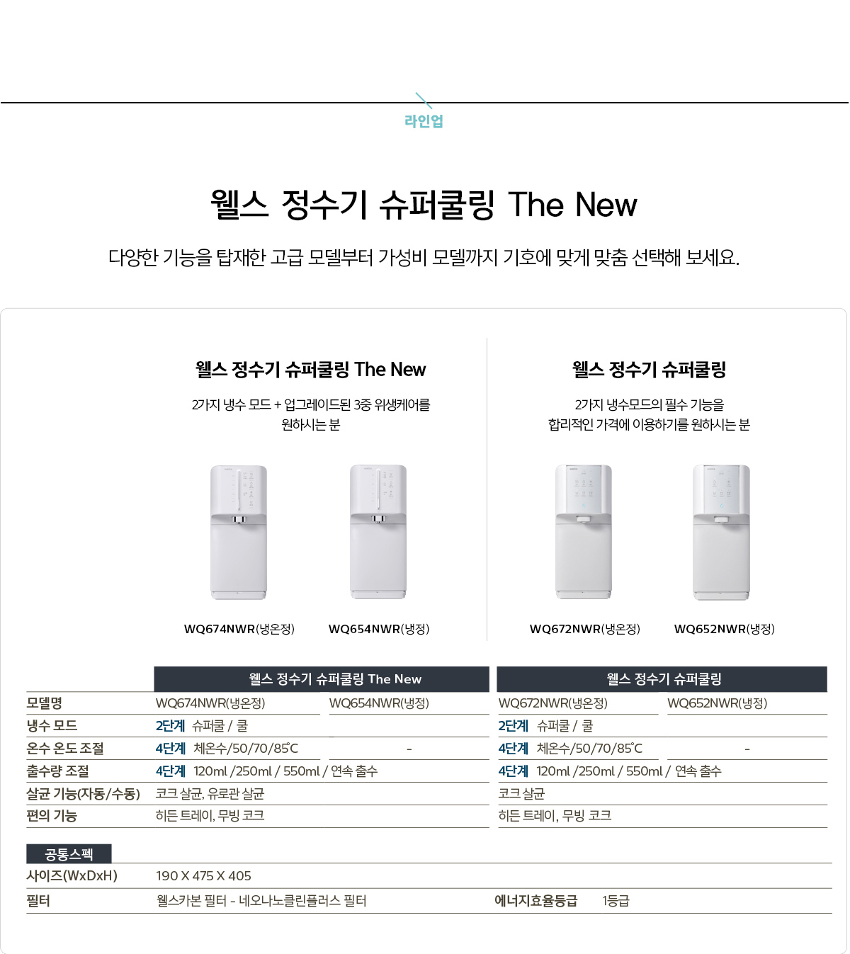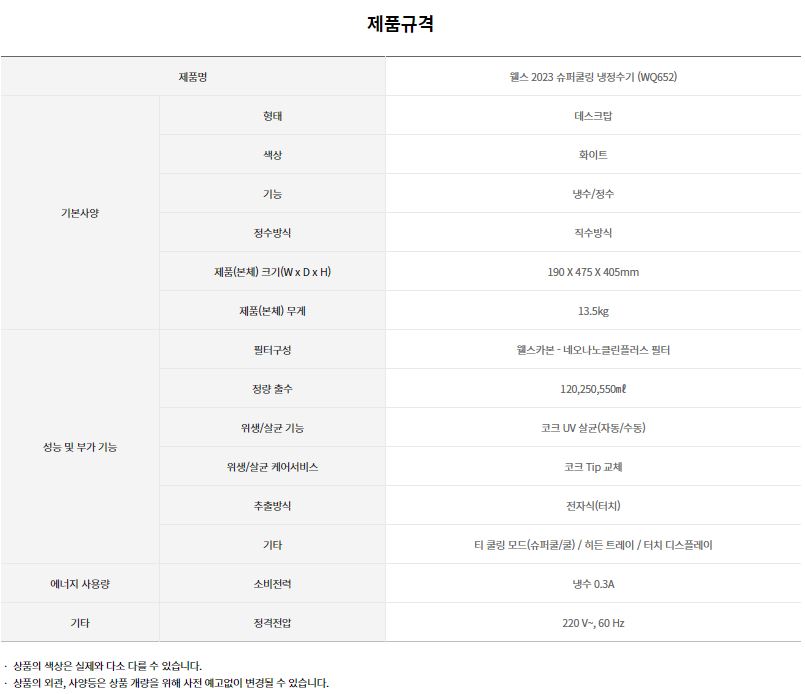 WQ652 교원웰스 [웰스] 2023 슈퍼쿨링 냉정수기 제품분류 정수기 정수방식 직수형 기능 냉수전용 AS기간 렌탈기간내 이벤트(5년방문) 3개월면제 이벤트(5년셀프) 2개월면제 최저 렌탈가 월 18,900 (렌탈가) 제휴카드 할인가 월 (렌탈가) 3년 5년 셀프관리 방문관리/12개월 방문관리/6개월 제품색상 선택 화이트 + 0원 할인 제휴카드 보기 렌탈신청 장바구니