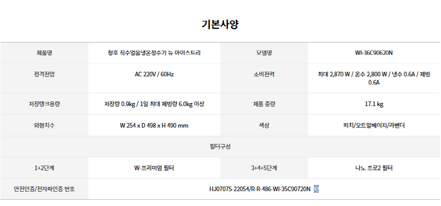 WI-36C90620N 청호나이스 [청호나이스] 얼음냉온정수기 뉴 아이스트리 제품분류 정수기 정수방식 직수형 기능 얼음냉온 AS기간 렌탈기간내 최저 렌탈가 월 45,900 (렌탈가) 제휴카드 할인가 월 (렌탈가) 3년 5년 6년 자가관리 방문관리/6개월 제품색상 선택 라벤더 + 0원 오트밀베이지 + 0원 피치 + 0원 할인 제휴카드 보기 렌탈신청 장바구니