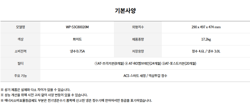 WP-53C80020M 청호나이스 [청호나이스] OMNI plus 냉정수기 제품분류 정수기 정수방식 탱크형 기능 냉수전용 AS기간 렌탈기간내 이벤트 1천원할인 최저 렌탈가 월 27,900 (렌탈가) 제휴카드 할인가 월 (렌탈가) 5년 방문관리/4개월 제품색상 선택 화이트 + 0원 할인 제휴카드 보기 렌탈신청 장바구니