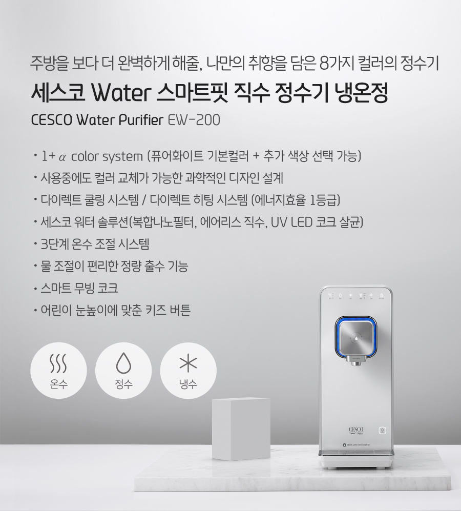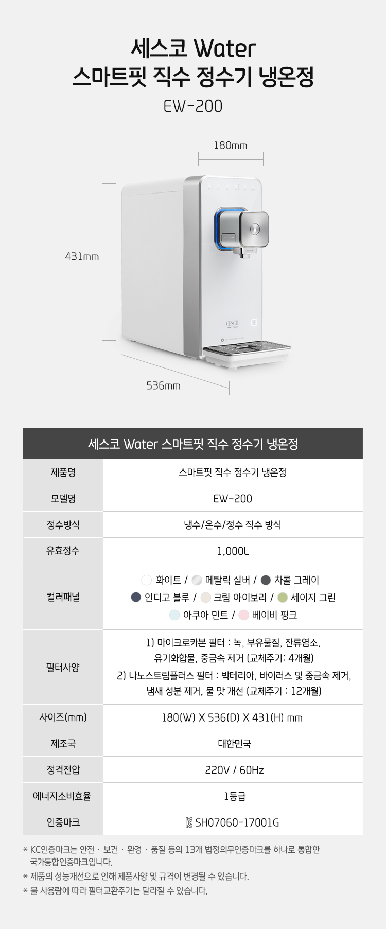 EW-200 세스코 [세스코] 스마트핏 직수 냉온정수기 제품분류 정수기 정수방식 직수형 기능 냉온전용 AS기간 렌탈기간내 최저 렌탈가 월 25,900 (렌탈가) 제휴카드 할인가 월 (렌탈가) 3년 5년 자가관리 방문관리/4개월 화이트 메탈릭실버 차콜그레이 인디고블루 크림아이보리 세이지그린 아쿠아민트 베이비핑크 할인 제휴카드 보기 렌탈신청 장바구니