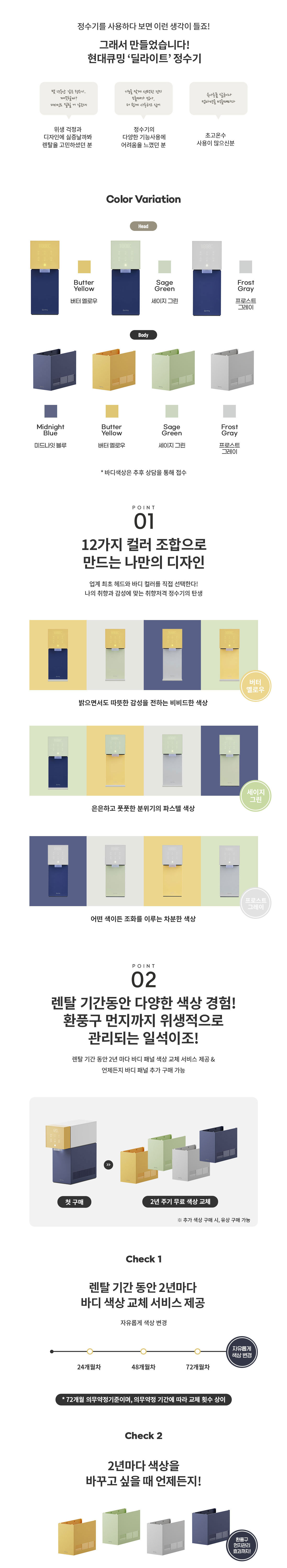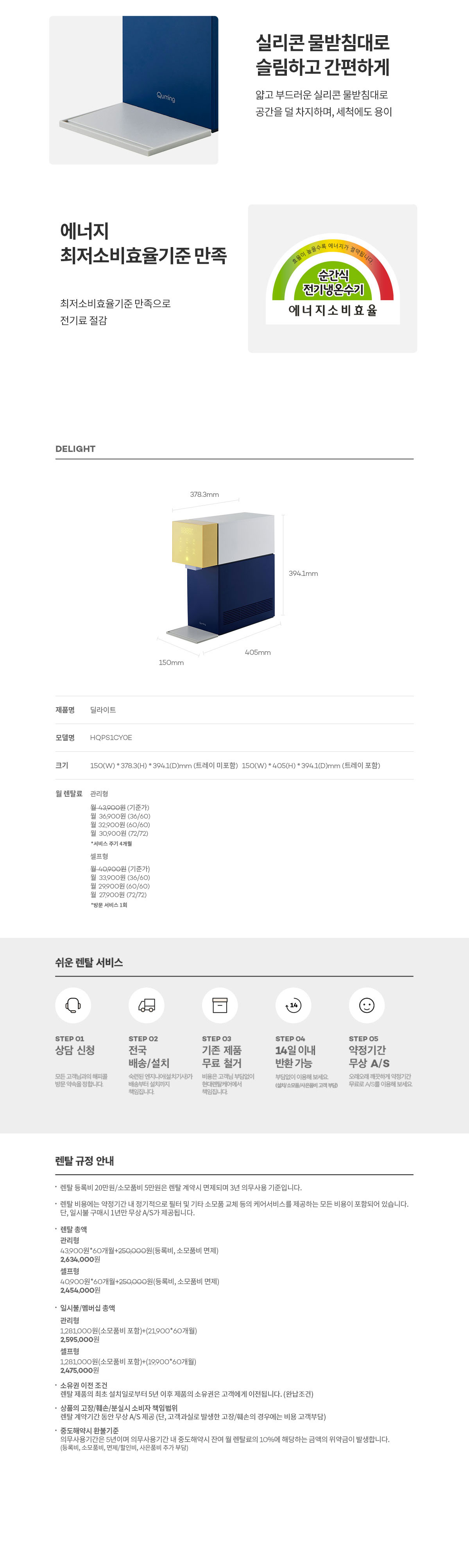 HQPS1CYOE 현대큐밍 [현대큐밍] 딜라이트 직수형 냉온정수기 제품분류 정수기 정수방식 직수형 기능 냉온전용 AS기간 렌탈기간내 최저 렌탈가 월 27,900 (렌탈가) 제휴카드 할인가 월 (렌탈가) 3년 5년 6년 자가관리 방문관리/4개월 헤드 선택 옐로우 + 0원 그린 + 0원 그레이 + 0원 바디 선택 블루 + 0원 옐로우 + 0원 그린 + 0원 그레이 + 0원 할인 제휴카드 보기 렌탈신청 장바구니