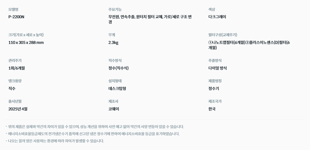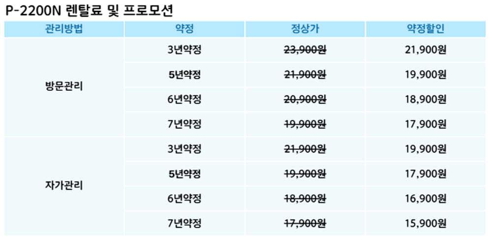 P-2200N 코웨이 [코웨이] 스위치 정수기 제품분류 정수기 정수방식 직수형 기능 정수전용 AS기간 렌탈기간내 최저 렌탈가 월 15,900 (렌탈가) 제휴카드 할인가 월 (렌탈가) 3년 5년 6년 7년 자가관리 방문관리/6개월 제품색상 선택 다크그레이 + 0원 포슬린화이트 + 0원 크림베이지 + 0원 트리플실버 + 0원 할인 제휴카드 보기 렌탈신청 장바구니