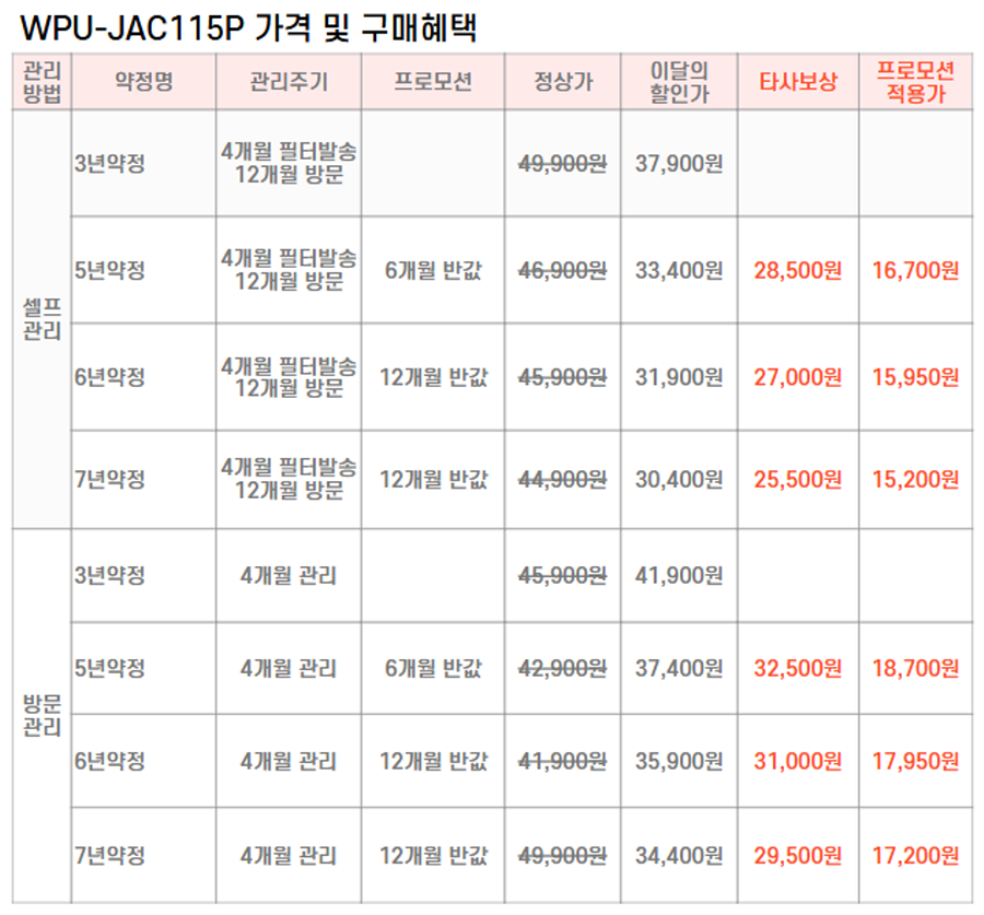 WPU-JAC115P SK매직 [SK매직] PSG 초소형 플러스 직수 정수기 제품분류 정수기 정수방식 직수형 기능 냉온전용 AS기간 렌탈기간내 최저 렌탈가 월 30,400 (렌탈가) 제휴카드 할인가 월 (렌탈가) 3년 5년 6년 7년 셀프관리 방문관리/4개월 제품색상 선택 네이비 + 0원 화이트 + 0원 할인 제휴카드 보기 렌탈신청 장바구니