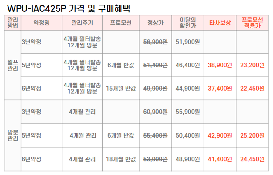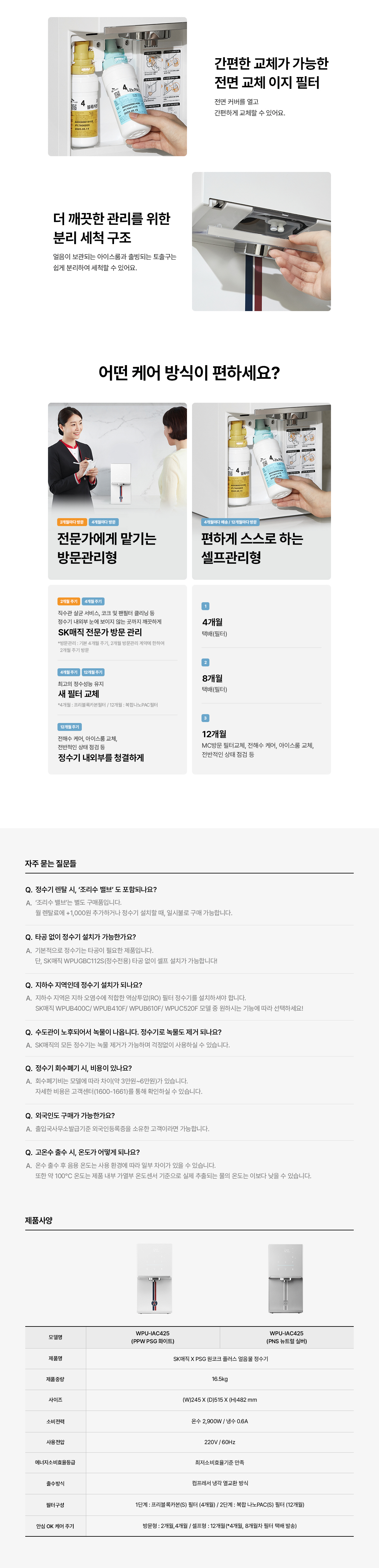 WPU-IAC425P SK매직 [SK매직] PSG 원코크 플러스 얼음물 정수기 제품분류 정수기 정수방식 직수형 기능 얼음냉온 AS기간 렌탈기간내 최저 렌탈가 월 44,900 (렌탈가) 제휴카드 할인가 월 (렌탈가) 3년 5년 6년 셀프관리 방문관리/4개월 제품색상 선택 화이트 + 0원 뉴트럴실버 + 0원 할인 제휴카드 보기 렌탈신청 장바구니
