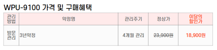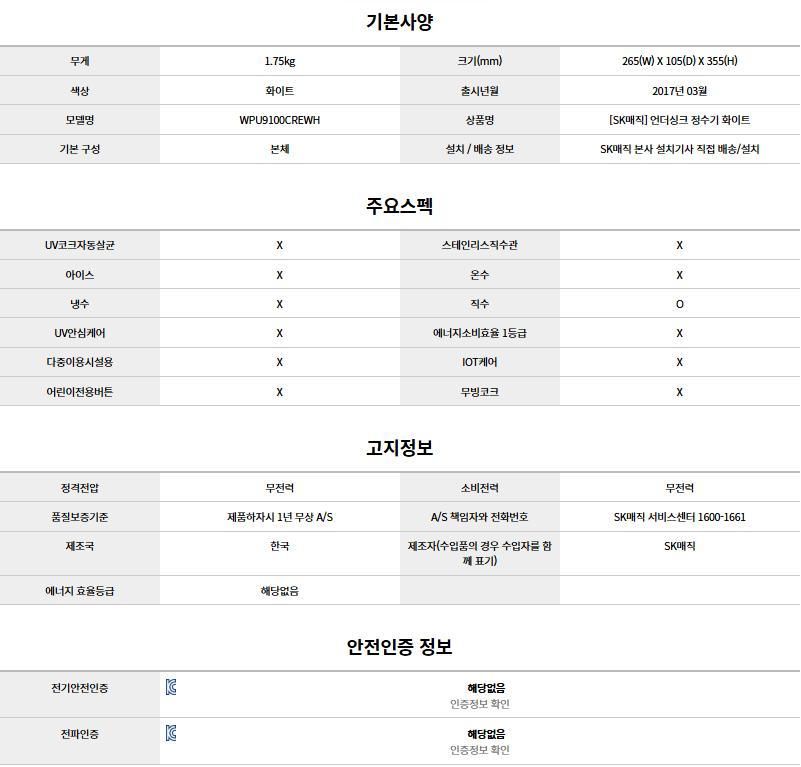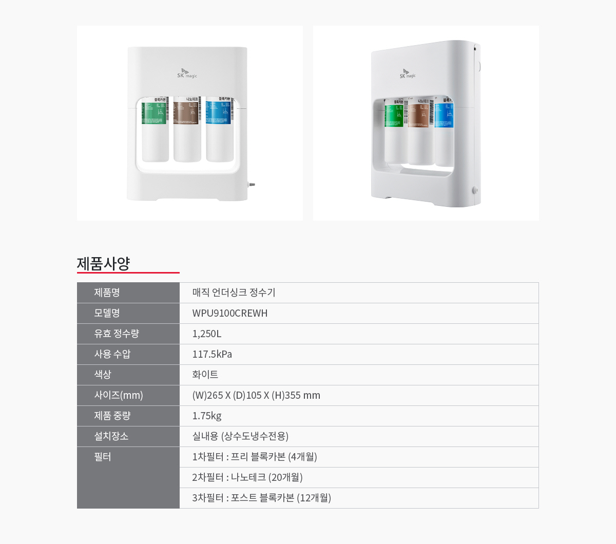 WPU-9100 SK매직 [SK매직] 언더싱크 정수기 제품분류 정수기 정수방식 직수형 기능 정수전용 AS기간 렌탈기간내 최저 렌탈가 월 18,900 (렌탈가) 제휴카드 할인가 월 (렌탈가) 3년 방문관리/4개월 할인 제휴카드 보기 렌탈신청 장바구니