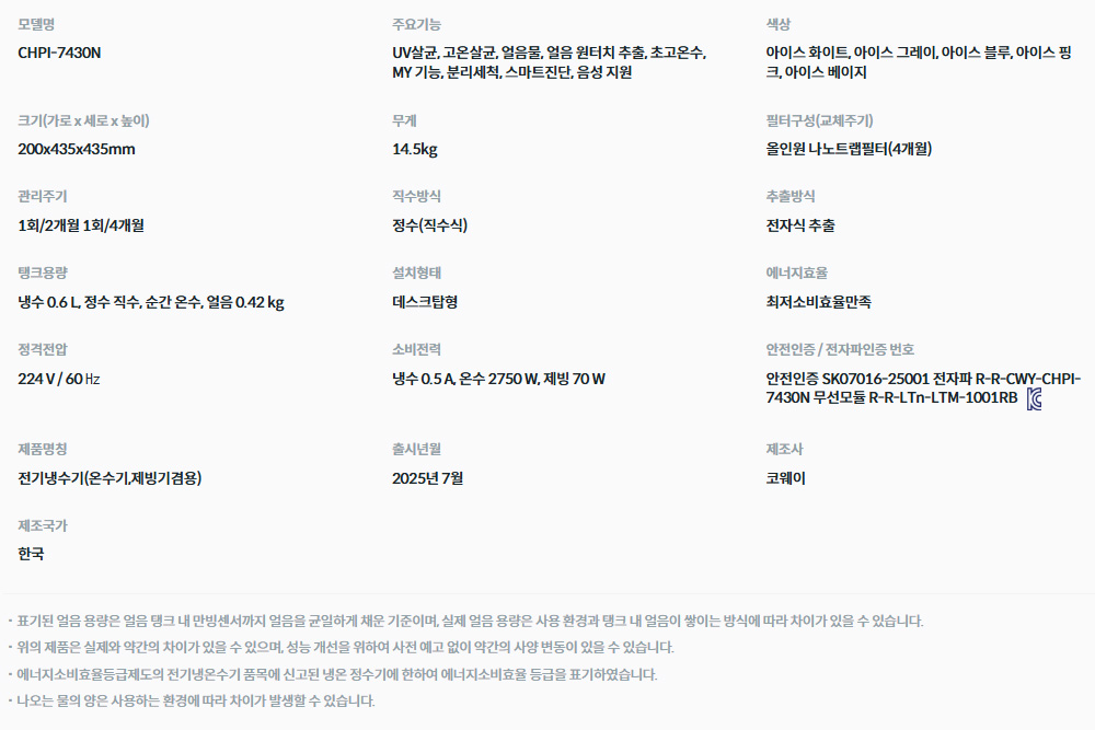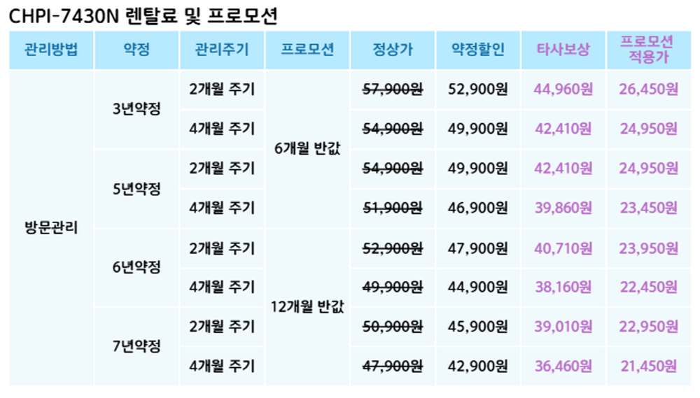 CHPI-7430N 코웨이 [코웨이] 아이콘 얼음정수기 미니 제품분류 정수기 정수방식 직수형 기능 얼음냉온 AS기간 렌탈기간내 최저 렌탈가 월 42,900 (렌탈가) 제휴카드 할인가 월 (렌탈가) 3년 5년 6년 7년 방문관리/4개월 방문관리/2개월 제품색상 선택 아이스화이트 + 0원 아이스블루 + 0원 아이스핑크 + 0원 아이스베이지 + 0원 아이스그레이 + 0원 할인 제휴카드 보기 렌탈신청 장바구니