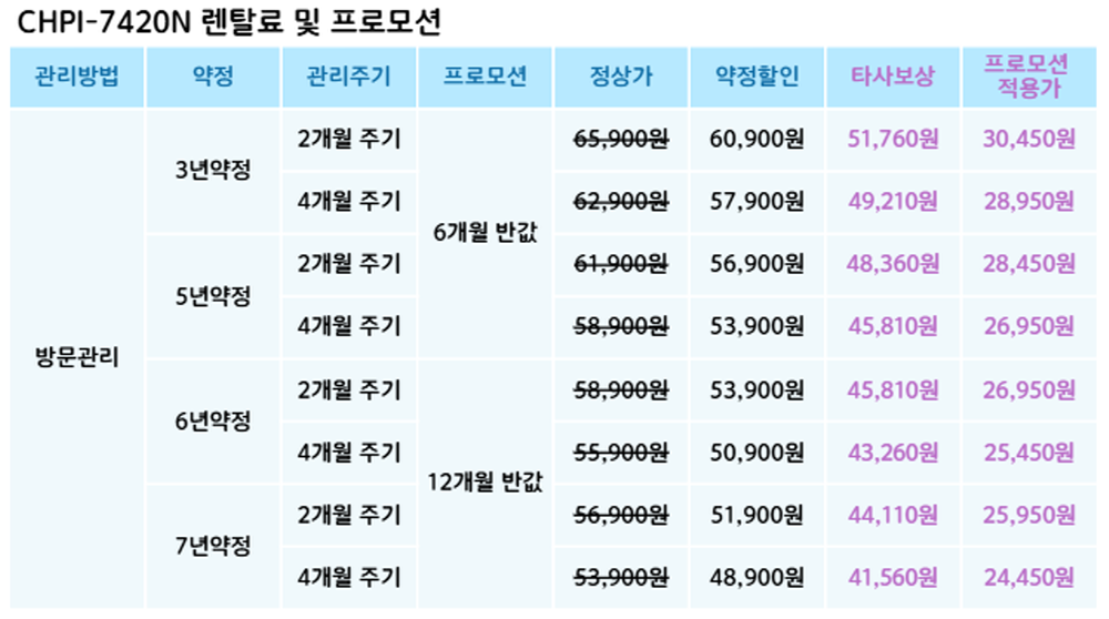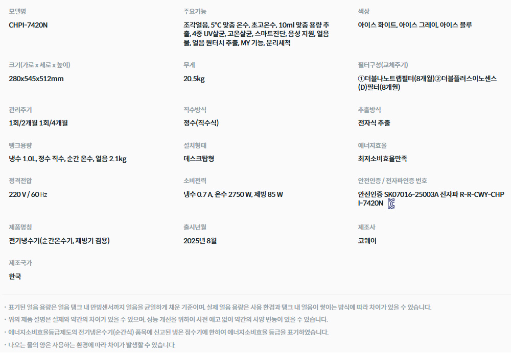 CHPI-7420N 코웨이 [코웨이] 아이콘 얼음정수기 맥스 제품분류 정수기 정수방식 직수형 기능 얼음냉온 AS기간 렌탈기간내 최저 렌탈가 월 48,900 (렌탈가) 제휴카드 할인가 월 (렌탈가) 3년 5년 6년 7년 방문관리/4개월 방문관리/2개월 제품색상 선택 아이스화이트 + 0원 아이스블루 + 0원 아이스그레이 + 0원 할인 제휴카드 보기 렌탈신청 장바구니
