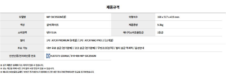 WP-30C8560N 청호나이스 [청호나이스] 냉정수기 제품분류 정수기 정수방식 직수형 기능 냉수전용 AS기간 렌탈기간내 최저 렌탈가 월 23,900 (렌탈가) 제휴카드 할인가 월 (렌탈가) 3년 5년 자가관리 방문관리/4개월 제품색상 선택 화이트 + 0원 실버 + 0원 할인 제휴카드 보기 렌탈신청 장바구니
