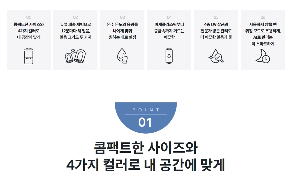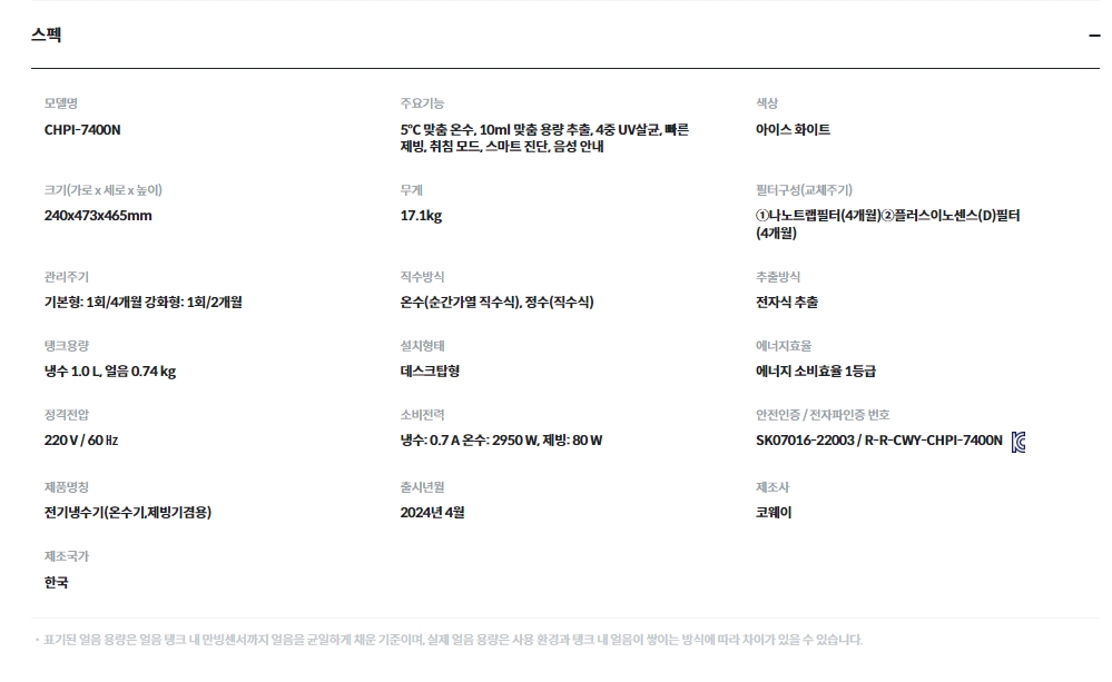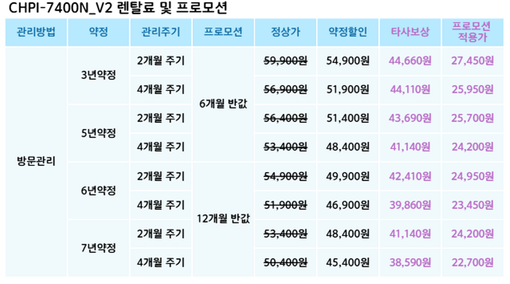 CHPI-7400N_V2 코웨이 [코웨이] 아이콘 얼음정수기 V2 제품분류 정수기 정수방식 직수형 기능 얼음냉온 AS기간 렌탈기간내 최저 렌탈가 월 45,400 (렌탈가) 제휴카드 할인가 월 (렌탈가) 3년 5년 6년 7년 방문관리/4개월 방문관리/2개월 제품색상 선택 아이스 화이트 + 0원 아이스 블루 + 0원 아이스 핑크 + 0원 아이스 그레이 + 0원 할인 제휴카드 보기 렌탈신청 장바구니