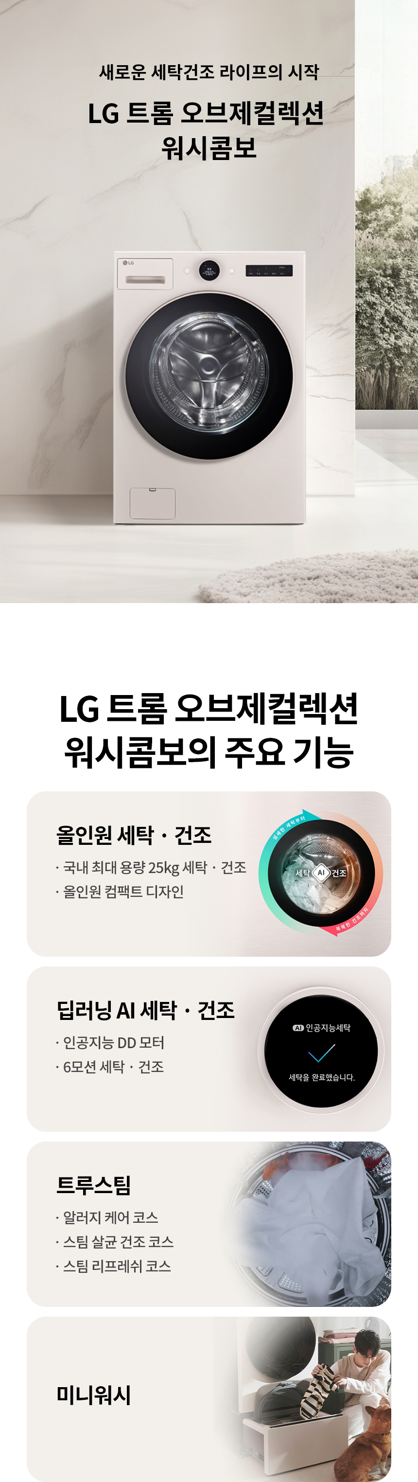 FH25ESE LG전자구독 [LG] 트롬 오브제컬렉션 워시콤보 세탁기 25kg / 건조기 15kg 네이처베이지 제품분류 건조기 세탁기 용량(총량) 25KG,15KG AS기간 렌탈기간내 최저 렌탈가 월 86,900 (렌탈가) 제휴카드 할인가 월 (렌탈가) 3년 4년 5년 6년 방문관리/6개월 방문관리/12개월 할인 제휴카드 보기 렌탈신청 장바구니