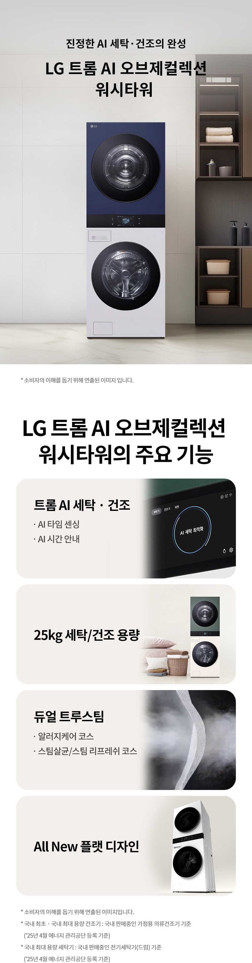 [LG] 트롬 AI 오브제컬렉션 워시타워 세탁기 25kg + 건조기 25kg 네이처크림그레이/네이처네이비