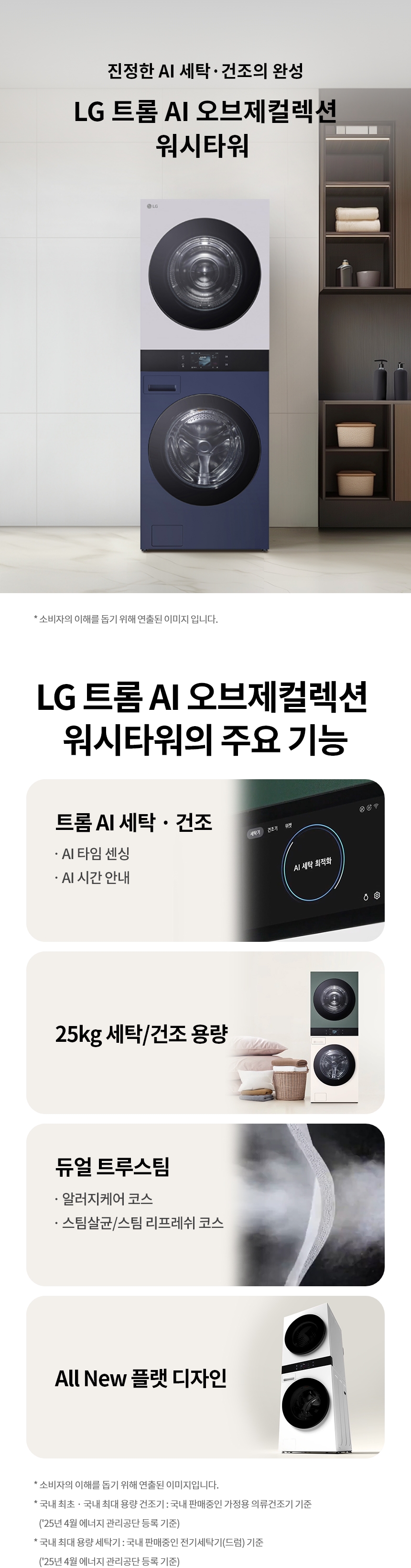 [LG] 트롬 AI 오브제컬렉션 워시타워 세탁기 25kg + 건조기 25kg 네이처네이비/네이처크림그레이