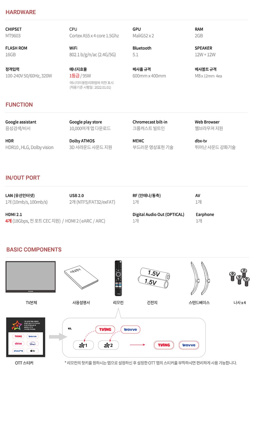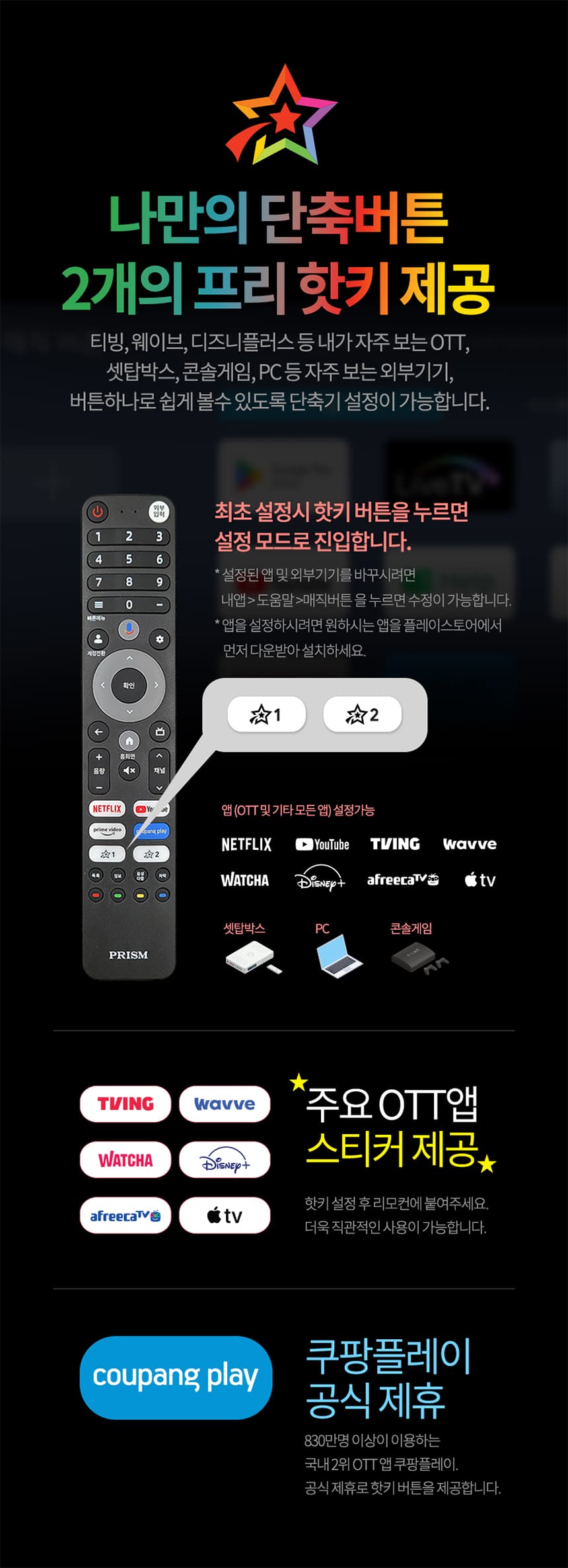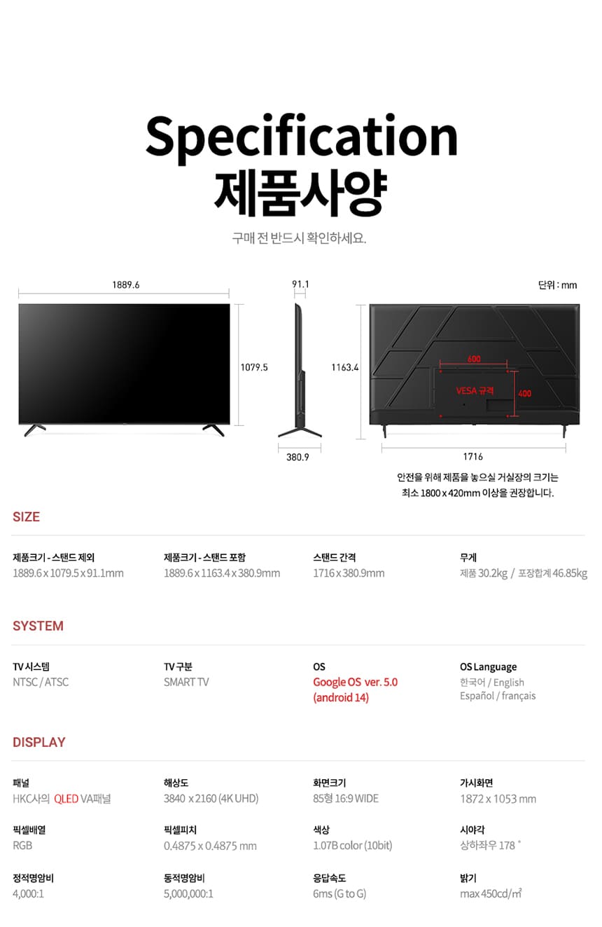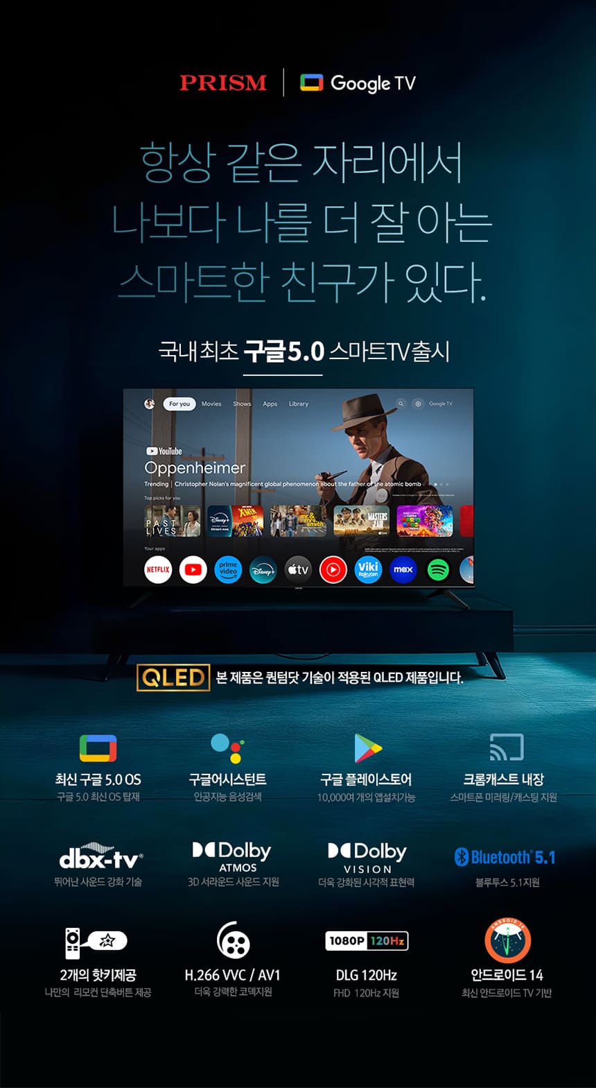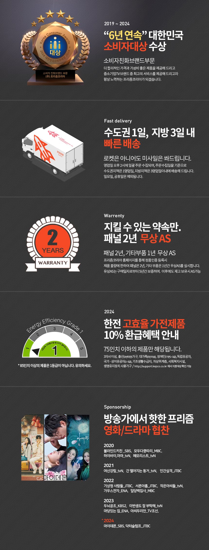 CP85G5Q 유버스 [프리즘코리아] 구글 스마트 QLED TV 85인치 제품분류 TV 제품규격 80인치이상 AS기간 1년 최저 렌탈가 월 63,900 (렌탈가) 제휴카드 할인가 월 (렌탈가) 3년 4년 5년 할인 제휴카드 보기 렌탈신청 장바구니