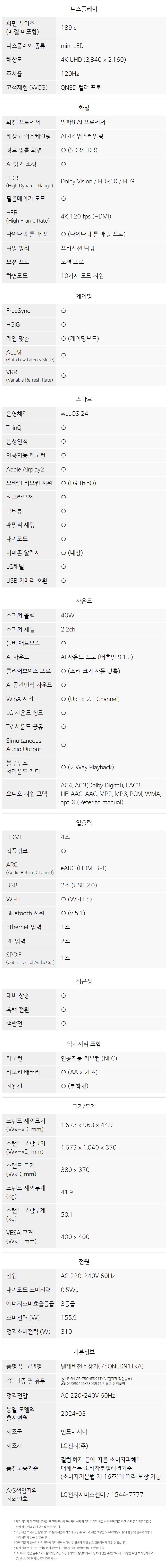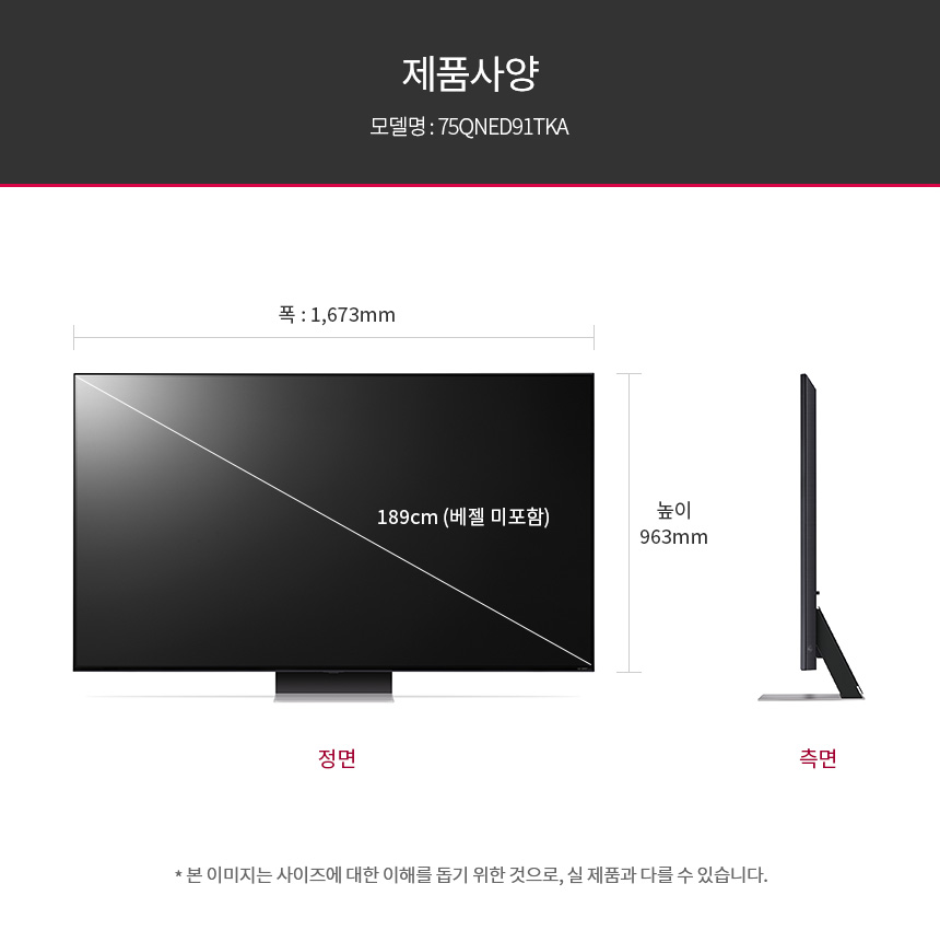 75QNED91TKA LG전자구독 [LG] QNED evo TV 75인치 제품분류 TV 제품규격 70~79인치 AS기간 렌탈기간내 최저 렌탈가 월 75,900 (렌탈가) 제휴카드 할인가 월 (렌탈가) 3년 4년 5년 6년 할인 제휴카드 보기 렌탈신청 장바구니