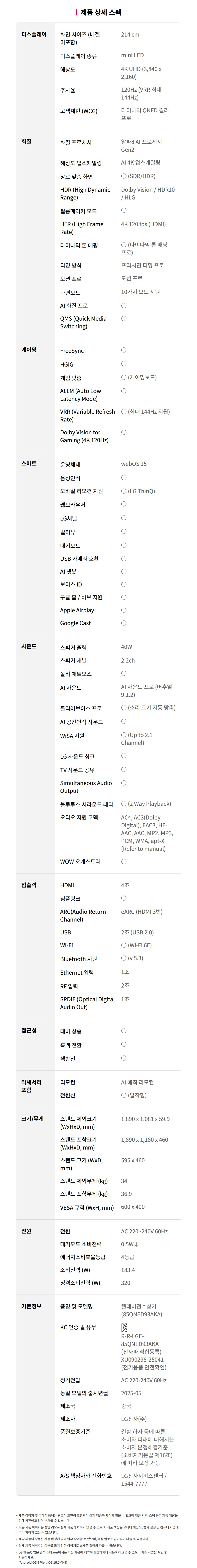 85QNED93AKA LG전자구독 [LG] QNED evo AI TV 85인치 제품분류 TV 제품규격 80인치이상 AS기간 렌탈기간내 최저 렌탈가 월 101,400 (렌탈가) 제휴카드 할인가 월 (렌탈가) 3년 4년 5년 6년 할인 제휴카드 보기 렌탈신청 장바구니