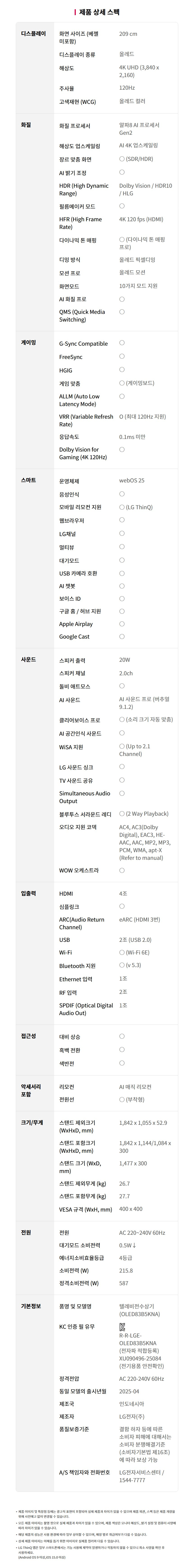 OLED83B5KNA LG전자구독 [LG] 올레드 TV 83인치 제품분류 TV 제품규격 80인치이상 AS기간 렌탈기간내 최저 렌탈가 월 149,500 (렌탈가) 제휴카드 할인가 월 (렌탈가) 3년 4년 5년 6년 할인 제휴카드 보기 렌탈신청 장바구니