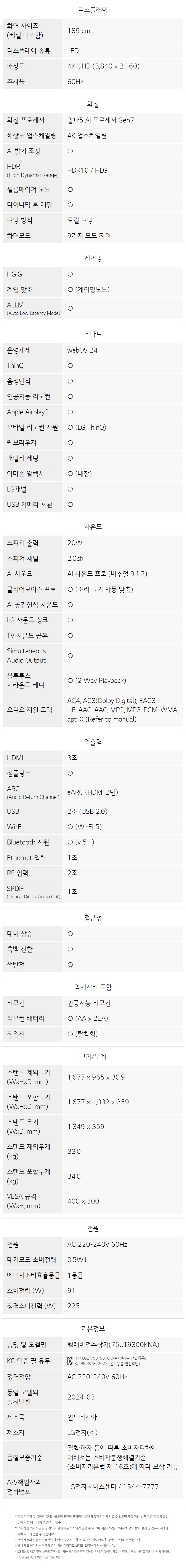 75UT9300KNA LG전자구독 [LG] 울트라 HD TV 75인치 제품분류 TV 제품규격 70~79인치 AS기간 렌탈기간내 최저 렌탈가 월 47,400 (렌탈가) 제휴카드 할인가 월 (렌탈가) 3년 4년 5년 6년 할인 제휴카드 보기 렌탈신청 장바구니