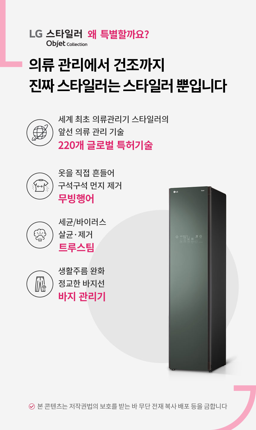 S3GOF LG전자구독 [LG] 트롬 오브제컬렉션 스타일러 미스트그린 제품분류 스타일러 AS기간 렌탈기간내 최저 렌탈가 월 30,900 (렌탈가) 제휴카드 할인가 월 (렌탈가) 3년 4년 5년 6년 방문관리/6개월 자가관리 할인 제휴카드 보기 렌탈신청 장바구니