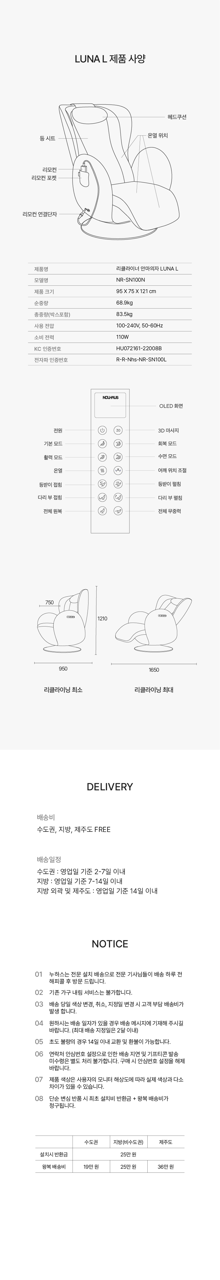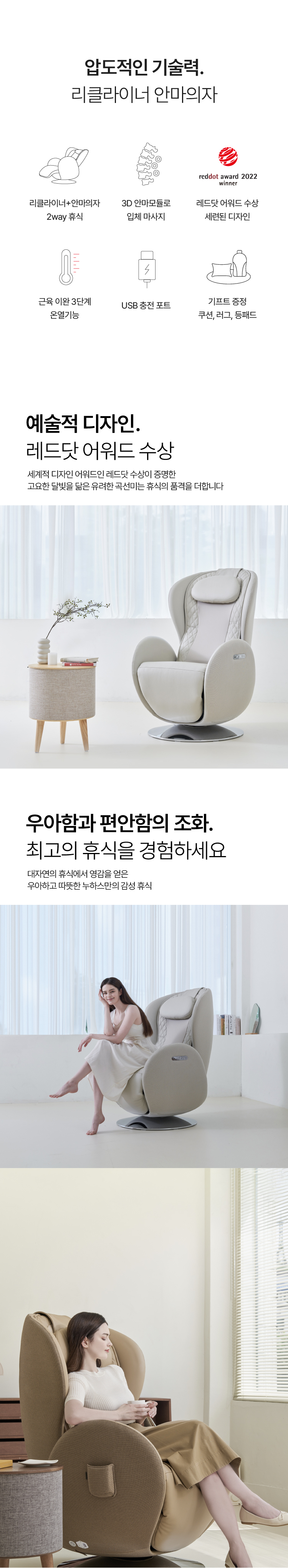 NR-SN100N 스마트렌탈 [누하스] 루나L 리클라이너 누하스안마의자 제품분류 안마의자 AS기간 1년 A/S기간 다중시설6개월 최저 렌탈가 월 50,900 (렌탈가) 제휴카드 할인가 월 (렌탈가) 3년 4년 5년 제품색상 선택 엘더화이트 + 0원 멜로우샌드 + 0원 할인 제휴카드 보기 렌탈신청 장바구니