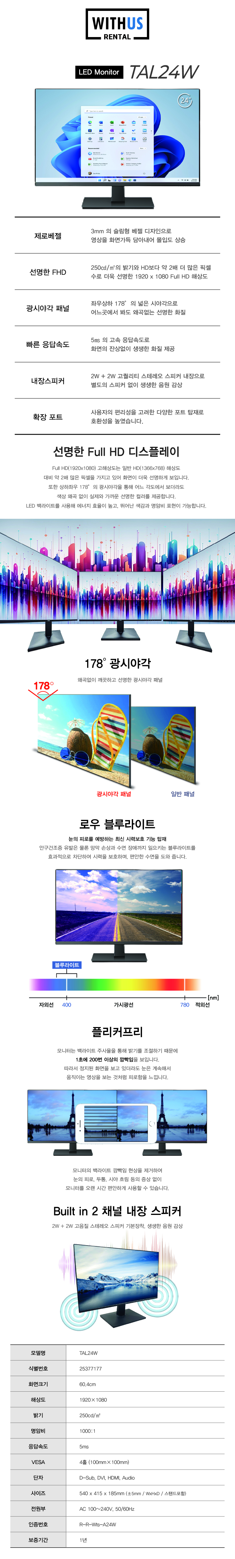 TAL24W 위더스렌탈 [위더스컴퓨터] LED 모니터 24인치 제품분류 노트북/PC 제품규격 24인치 AS기간 3년 최저 렌탈가 월 6,000 (렌탈가) 3년 할인 제휴카드 보기 렌탈신청 장바구니