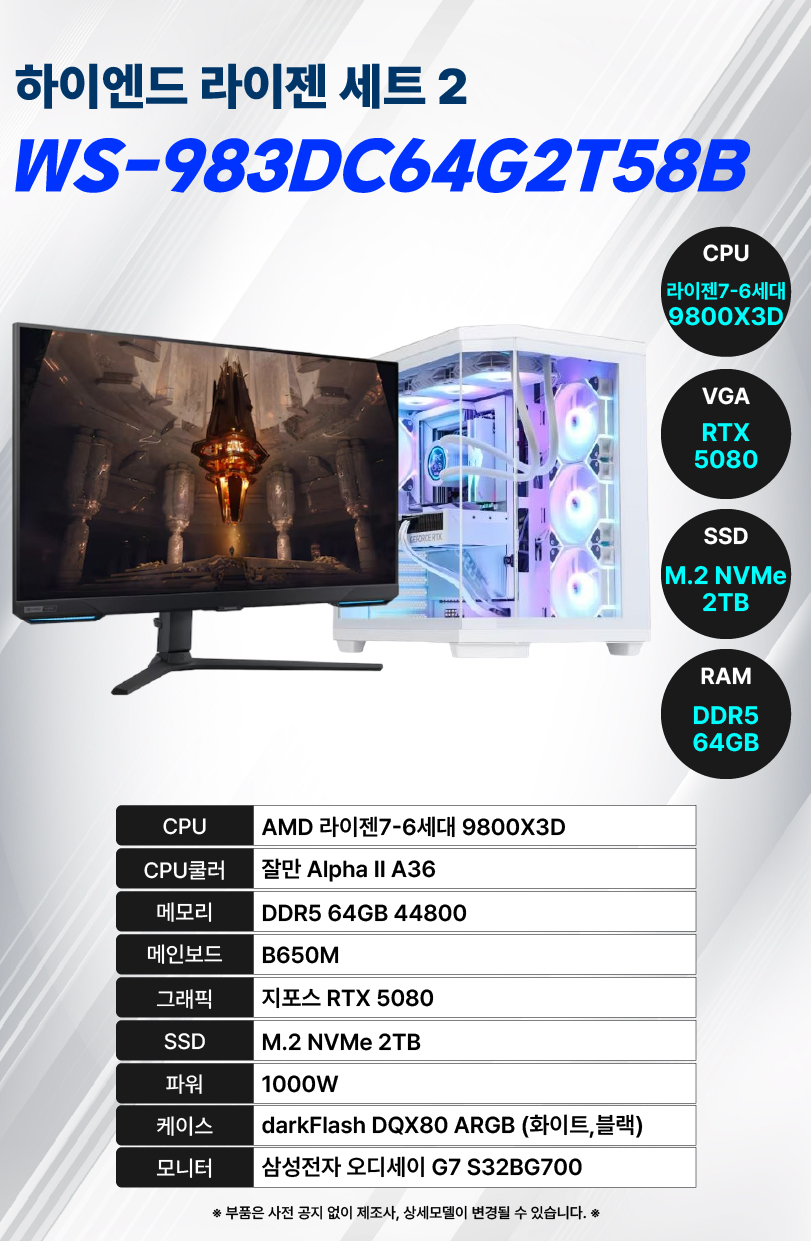 WS-983DC64G2T58B 위더스렌탈 [위더스컴퓨터] 하이엔드 라이젠 PC 데스크탑 세트 제품분류 노트북/PC AS기간 3년 최저 렌탈가 월 259,000 (렌탈가) 3년 할인 제휴카드 보기 렌탈신청 장바구니