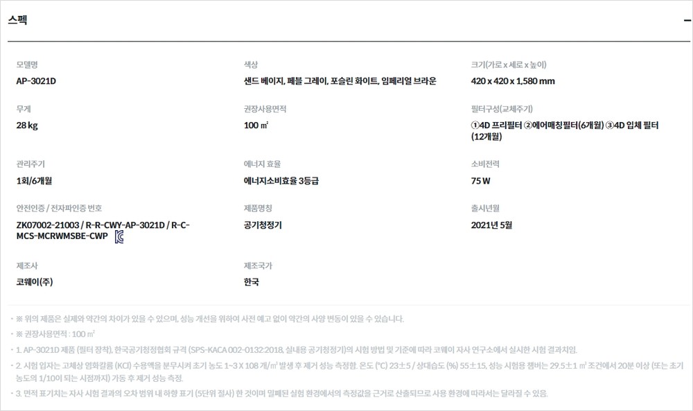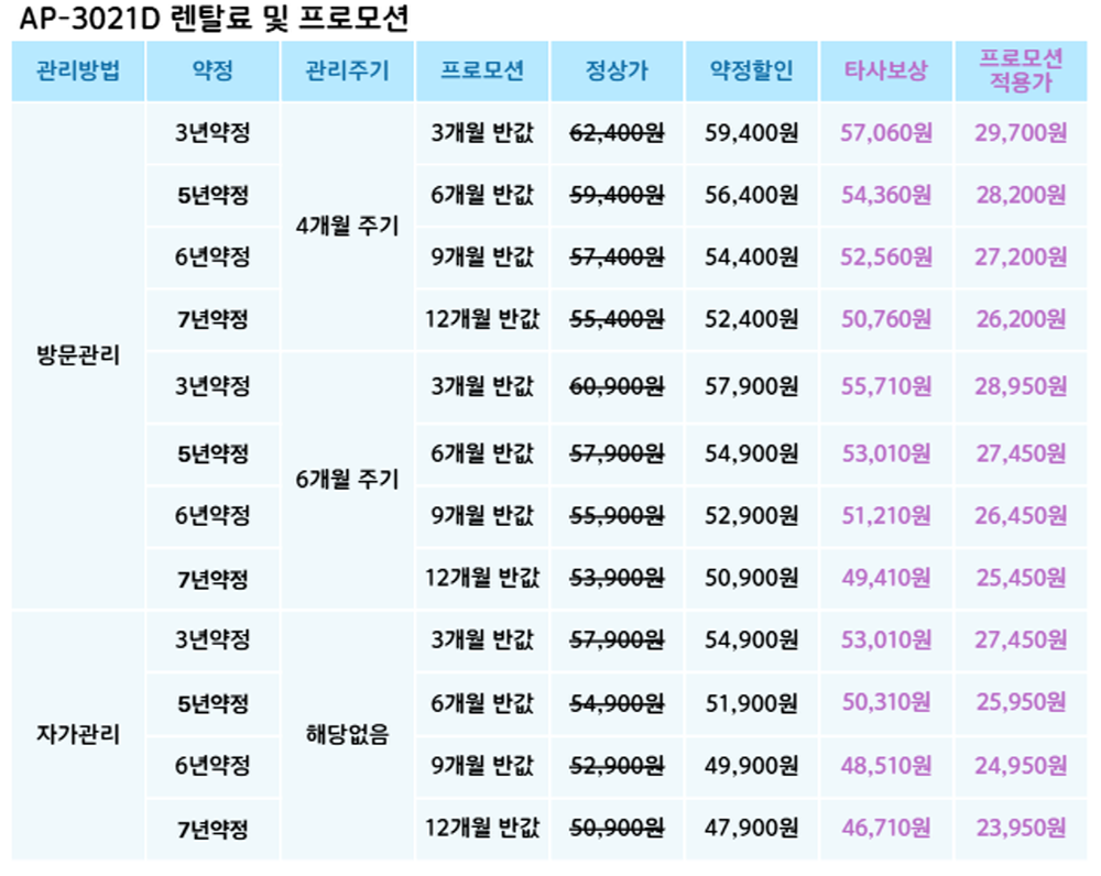 AP-3021D 코웨이 [코웨이] 노블 공기청정기 30평형 제품분류 청정기 AS기간 렌탈기간내 최저 렌탈가 월 47,900 (렌탈가) 제휴카드 할인가 월 (렌탈가) 3년 5년 6년 7년 자가관리 방문관리/6개월 방문관리/4개월 제품색상 선택 포슬린화이트 + 0원 샌드베이지 + 0원 페블그레이 + 0원 할인 제휴카드 보기 렌탈신청 장바구니