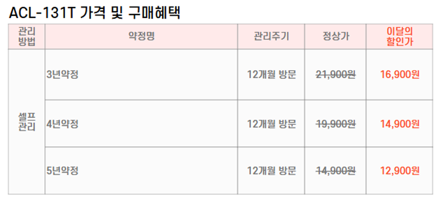 ACL-131T SK매직 [SK매직] 코어 360˚ 공기청정기 13평형 제품분류 청정기 AS기간 렌탈기간내 최저 렌탈가 월 12,900 (렌탈가) 제휴카드 할인가 월 (렌탈가) 3년 4년 5년 셀프관리 제품색상 선택 다크그레이 + 0원 할인 제휴카드 보기 렌탈신청 장바구니