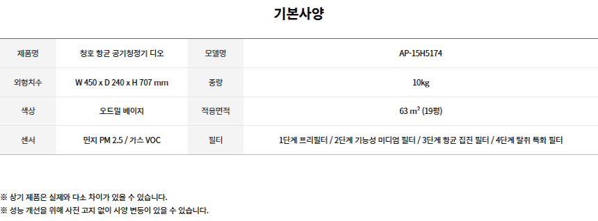 AP-15H5174 청호나이스 [청호나이스] 디오 향균 공기청정기 19평형 오트밀베이지 제품분류 청정기 AS기간 렌탈기간내 이벤트(5년) 2천원할인 이벤트(6년) 4천원할인 최저 렌탈가 월 18,900 (렌탈가) 제휴카드 할인가 월 (렌탈가) 3년 5년 6년 방문관리/4개월 방문관리/2개월 자가관리 할인 제휴카드 보기 렌탈신청 장바구니