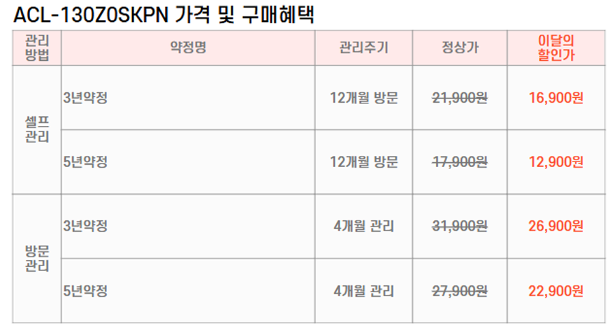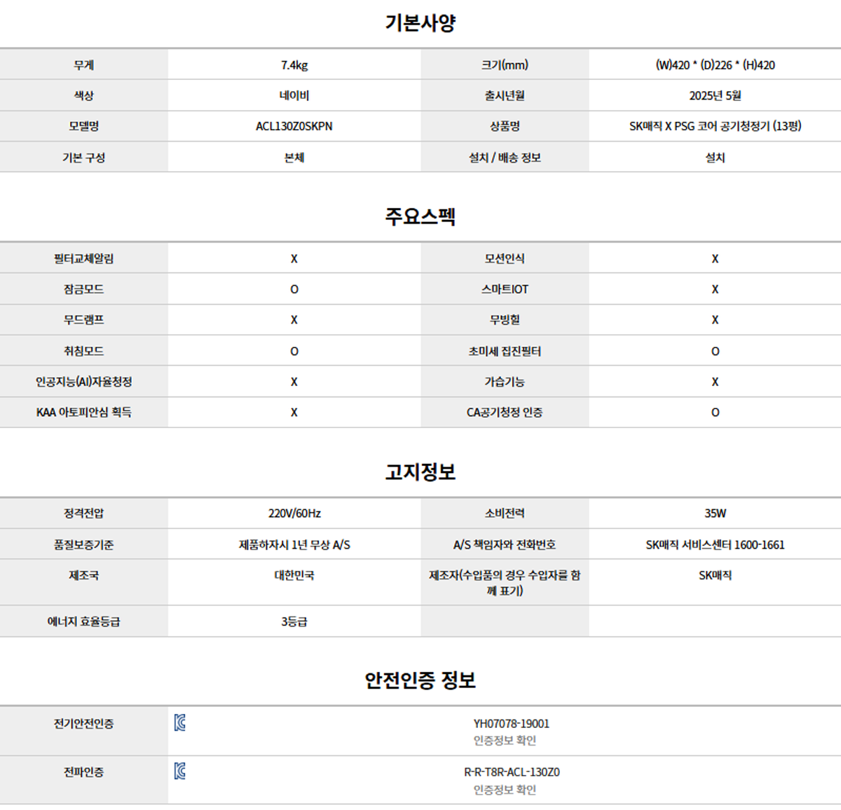 ACL-130Z0SKPN SK매직 [SK매직] PSG 코어 공기청정기 13평형 제품분류 청정기 AS기간 렌탈기간내 최저 렌탈가 월 12,900 (렌탈가) 제휴카드 할인가 월 (렌탈가) 3년 5년 셀프관리 방문관리/4개월 제품색상 선택 네이비 + 0원 할인 제휴카드 보기 렌탈신청 장바구니