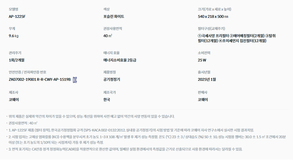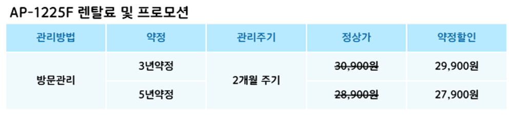 AP-1225F 코웨이 [코웨이] 벽걸이 공기청정기2 12평형 제품분류 청정기 AS기간 렌탈기간내 최저 렌탈가 월 27,900 (렌탈가) 제휴카드 할인가 월 (렌탈가) 3년 5년 방문관리/2개월 할인 제휴카드 보기 렌탈신청 장바구니