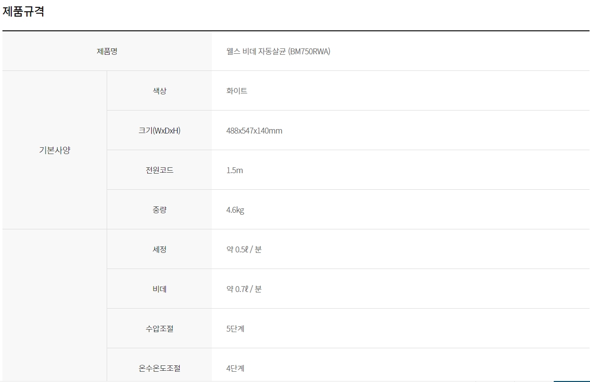 BM750RWA 교원웰스 [웰스] 비데 자동살균 제품분류 비데 AS기간 렌탈기간내 이벤트(5년) 3개월면제 최저 렌탈가 월 24,900 (렌탈가) 제휴카드 할인가 월 (렌탈가) 3년 5년 방문관리/3개월 할인 제휴카드 보기 렌탈신청 장바구니