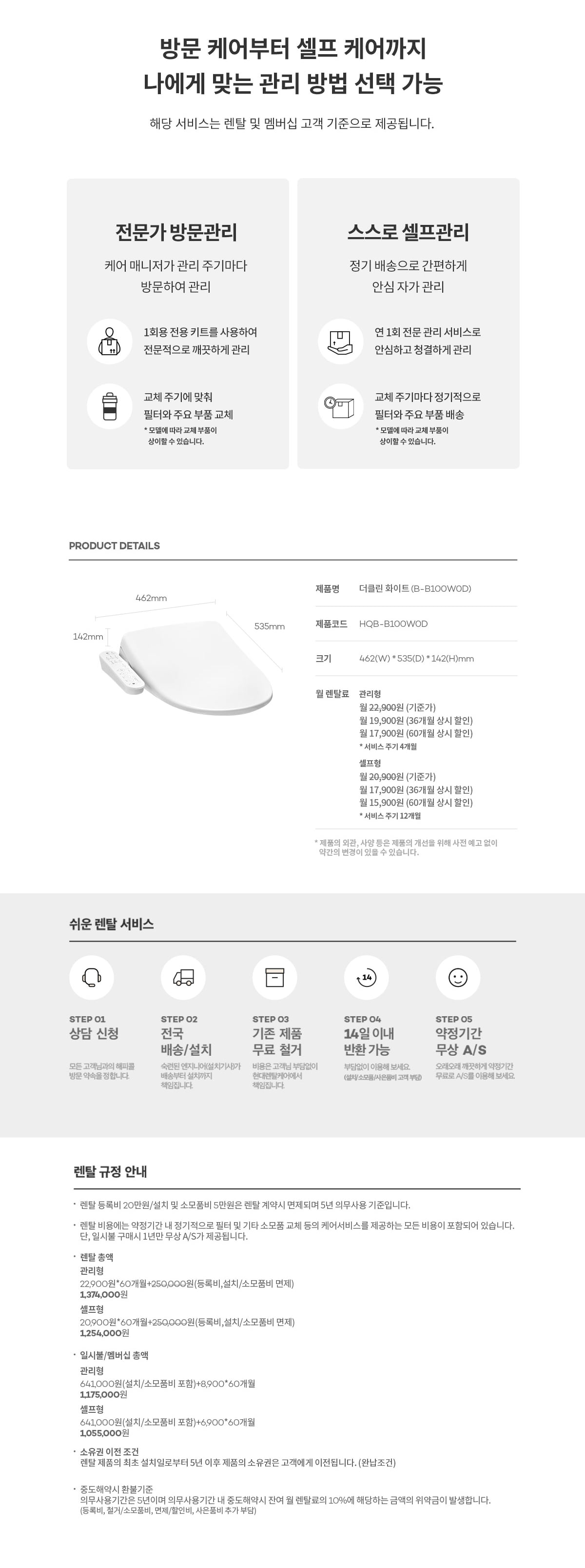 HQBB100W1D 현대큐밍 [현대큐밍] 더클린 화이트 제품분류 비데 AS기간 렌탈기간내 최저 렌탈가 월 16,900 (렌탈가) 제휴카드 할인가 월 (렌탈가) 3년 5년 자가관리 방문관리/4개월 할인 제휴카드 보기 렌탈신청 장바구니