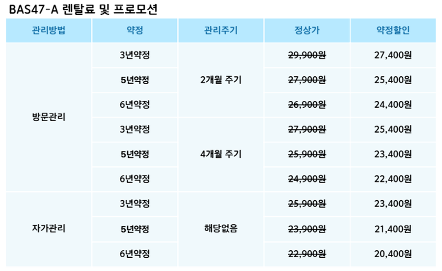 BAS47-A 코웨이 [코웨이] 스스로케어 비데 리모트2 제품분류 비데 AS기간 렌탈기간내 최저 렌탈가 월 20,400 (렌탈가) 제휴카드 할인가 월 (렌탈가) 3년 5년 6년 자가관리 방문관리/4개월 할인 제휴카드 보기 렌탈신청 장바구니