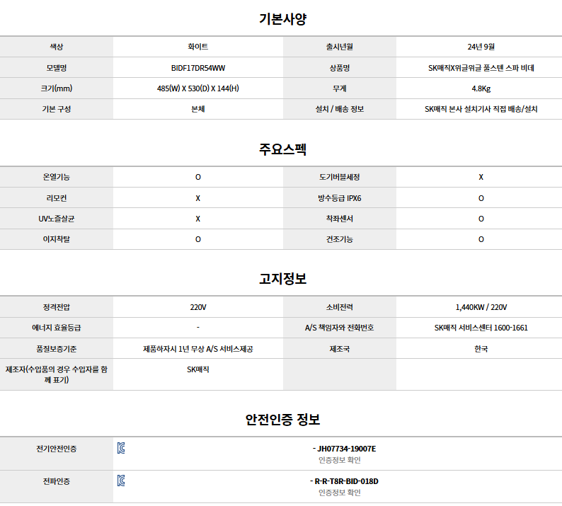 BID-F17DR54 SK매직 [SK매직] 위글위글 풀스텐 스파 비데 제품분류 비데 AS기간 렌탈기간내 최저 렌탈가 월 15,900 (렌탈가) 제휴카드 할인가 월 (렌탈가) 3년 4년 5년 셀프관리 방문관리/4개월 할인 제휴카드 보기 렌탈신청 장바구니