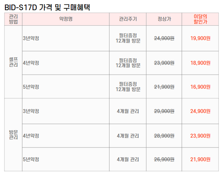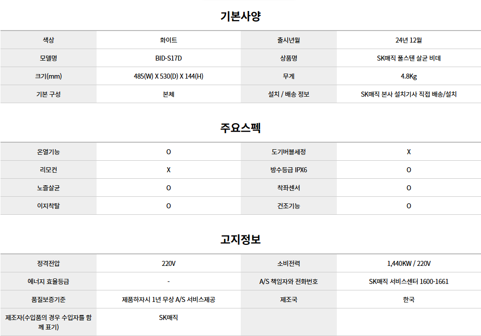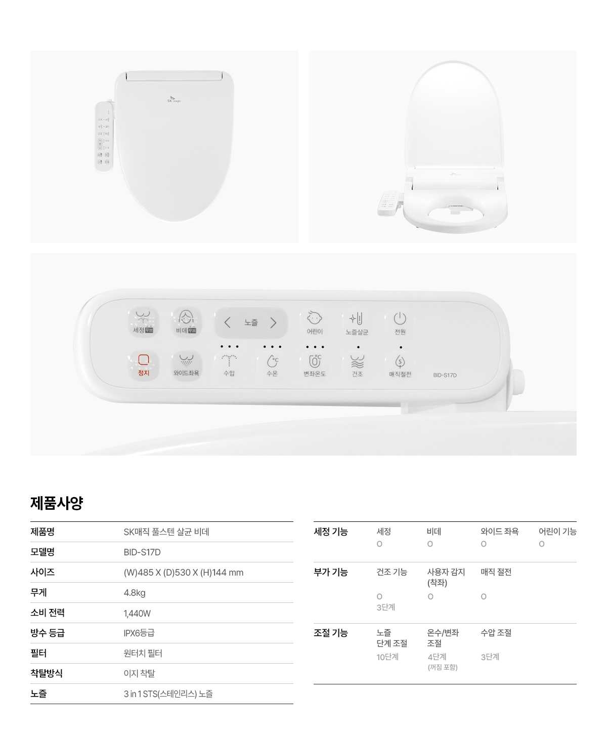 BID-S17D SK매직 [SK매직] 풀스텐 살균 비데 제품분류 비데 AS기간 렌탈기간내 최저 렌탈가 월 16,900 (렌탈가) 제휴카드 할인가 월 (렌탈가) 3년 4년 5년 셀프관리 방문관리/4개월 할인 제휴카드 보기 렌탈신청 장바구니