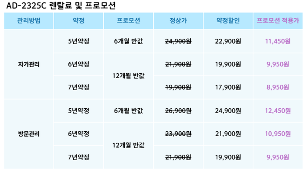 1644-7658 빠르고 간편한 렌탈 상담신청 개인정보 수집/이용 내용보기 동의 미동의 ※ 개인정보수집이용 동의 1. 개인정보의 수집 및 이용목적 : 원활한 렌탈 상담 및 주문을 위한 참조자료로 아래와 같은 항목의 개인정보를 수집하고 있습니다 2. 수집하려는 개인정보 항목 : 필수 수집항목 : 이름, 연락처 3. 개인정보의 보유 및 이용기간 : 수집된 정보는 이용자의 정보 삭제 요구 시까지 보관, 활용하며 수집 및 이용 목적이 달성된 후 해당 정보를 지체 없이 파기합니다. 단순 상담고객 3개월 후 파기 / 계약 고객 12개월 후 파기 4. 개인정보 취급 담당자 : 이름 : 박현식연락처 : 1644-7658 5. 개인정보 수집 동의거부 사항 : 이용자의 개인정보는 원활한 상담을 위해 수집하고 있으며, 동의하지 않을 경우 상담 및 주문이 제한됩니다. [닫기]