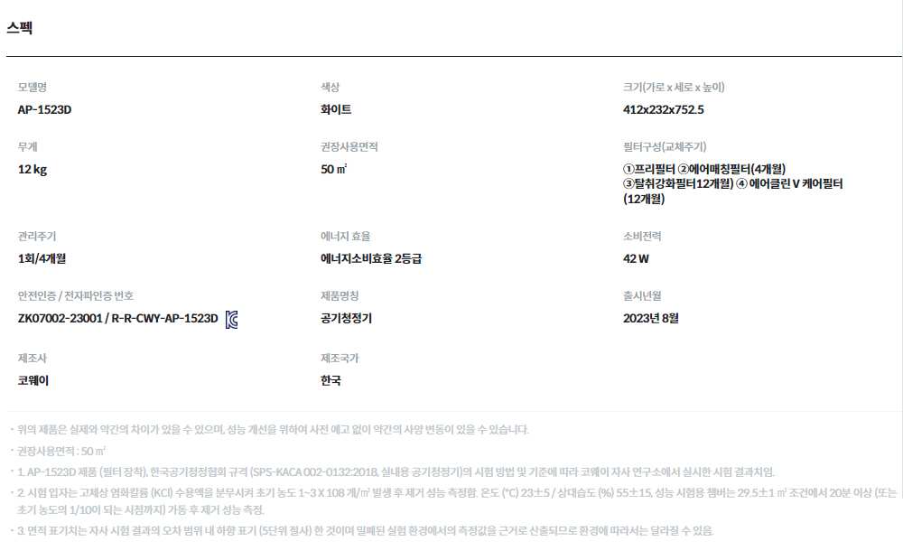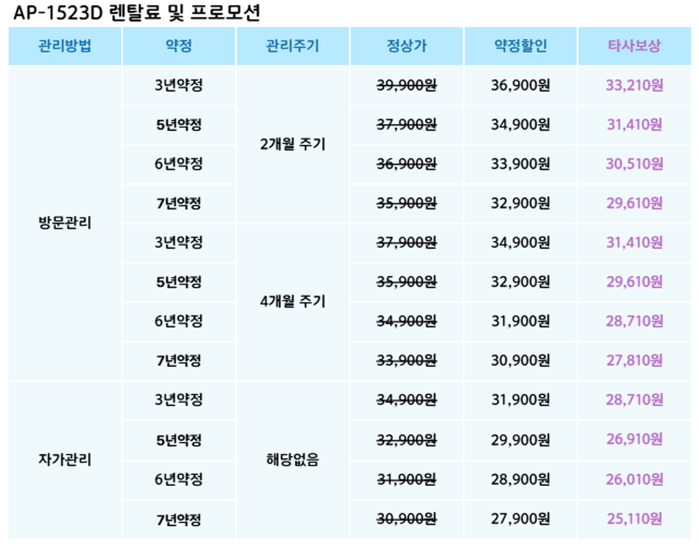 AP-1523D 코웨이 [코웨이] 멀티액션 공기청정기2 15평형 제품분류 청정기 AS기간 렌탈기간내 최저 렌탈가 월 27,900 (렌탈가) 제휴카드 할인가 월 (렌탈가) 3년 5년 6년 7년 자가관리 방문관리/4개월 방문관리/2개월 할인 제휴카드 보기 렌탈신청 장바구니