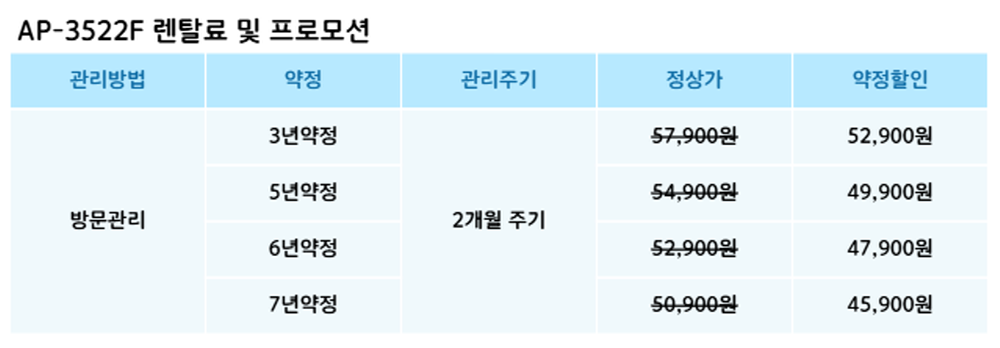 AP-3522F 코웨이 [코웨이] 파워업 공기청정기 35평형 제품분류 청정기 AS기간 렌탈기간내 최저 렌탈가 월 45,900 (렌탈가) 제휴카드 할인가 월 (렌탈가) 3년 5년 6년 7년 방문관리/2개월 할인 제휴카드 보기 렌탈신청 장바구니