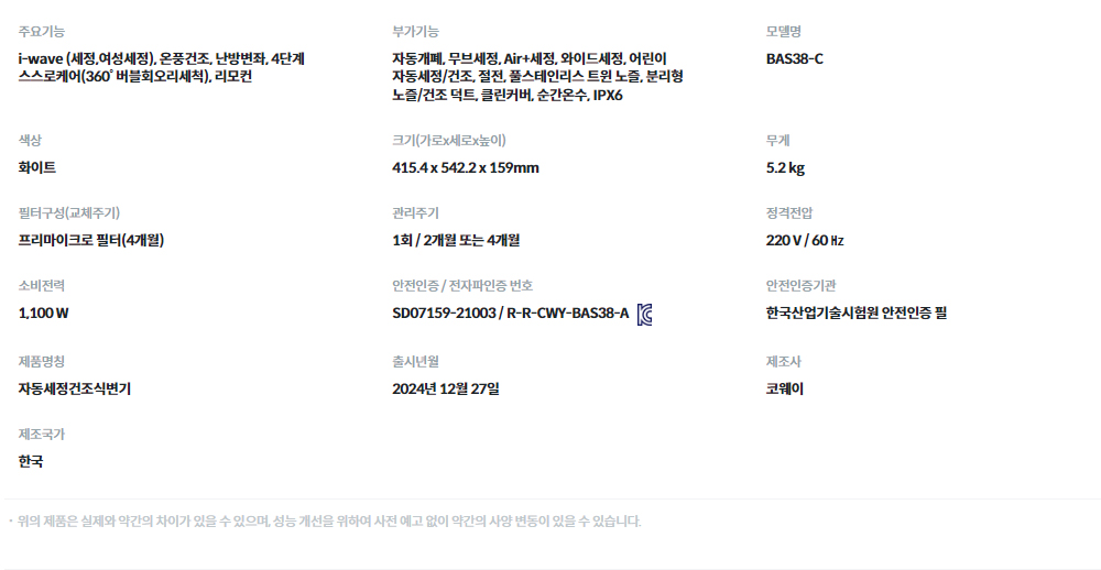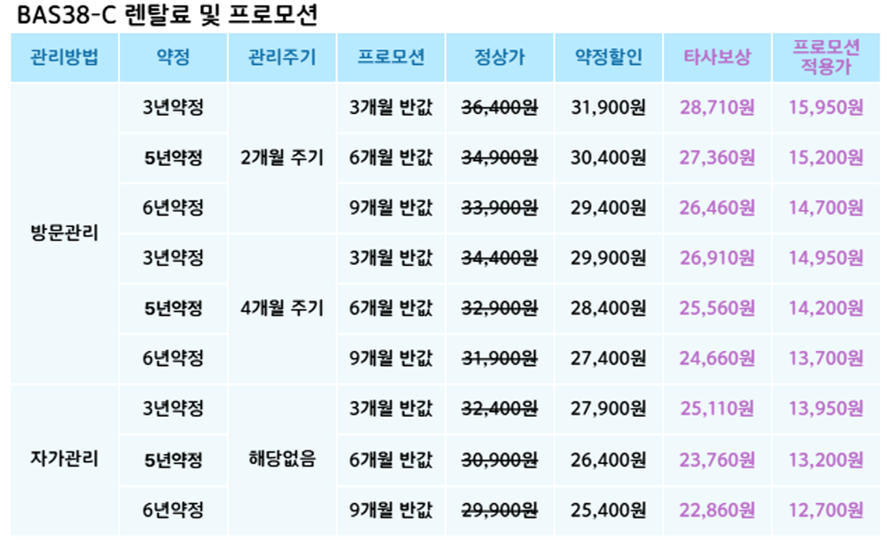 BAS38-C 코웨이 [코웨이] 더블케어 플러스 비데2 제품분류 비데 AS기간 렌탈기간내 최저 렌탈가 월 25,400 (렌탈가) 제휴카드 할인가 월 (렌탈가) 3년 5년 6년 자가관리 방문관리/4개월 할인 제휴카드 보기 렌탈신청 장바구니