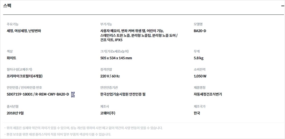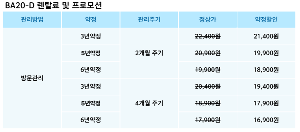 BA20-D 코웨이 [코웨이] 프라임 비데 단체전용 제품분류 비데 AS기간 렌탈기간내 최저 렌탈가 월 16,900 (렌탈가) 제휴카드 할인가 월 (렌탈가) 3년 5년 6년 방문관리/4개월 방문관리/2개월 할인 제휴카드 보기 렌탈신청 장바구니