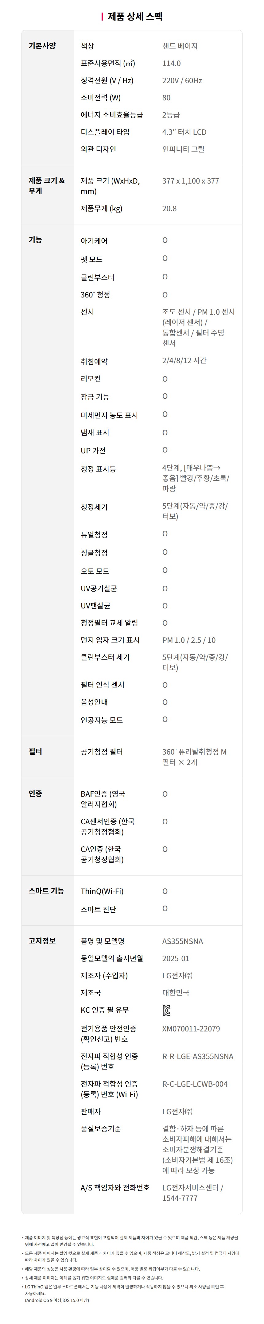 AS355NSNAM LG전자구독 [LG] 퓨리케어 AI+ 360˚ 공기청정기 35평형 샌드베이지 제품분류 청정기 AS기간 렌탈기간내 최저 렌탈가 월 58,900 (렌탈가) 제휴카드 할인가 월 (렌탈가) 3년 4년 5년 6년 방문관리/3개월 방문관리/6개월 자가관리 할인 제휴카드 보기 렌탈신청 장바구니