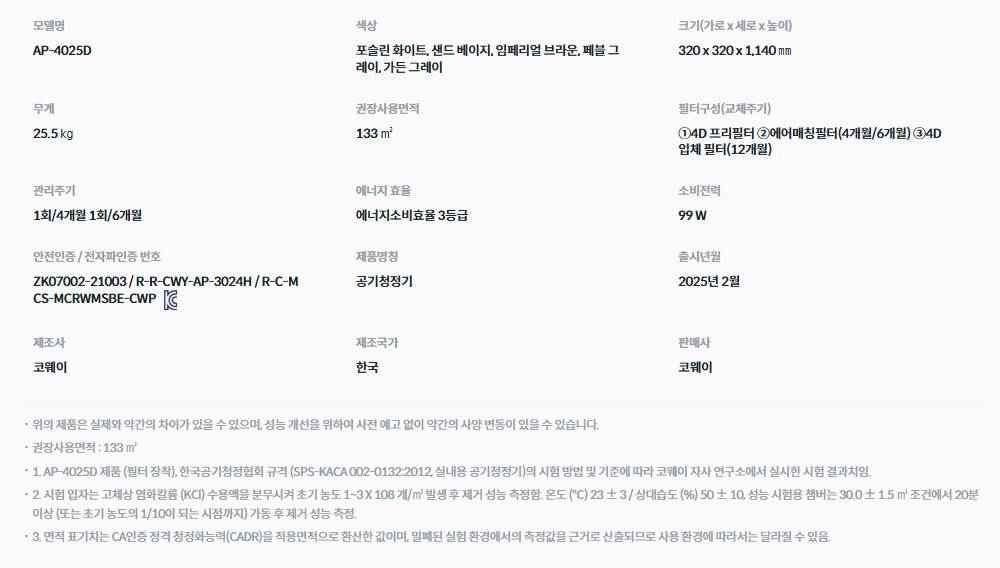 AP-4025D 코웨이 [코웨이] 노블 공기청정기2 40평형 제품분류 청정기 AS기간 렌탈기간내 최저 렌탈가 월 51,900 (렌탈가) 제휴카드 할인가 월 (렌탈가) 3년 5년 6년 7년 자가관리 방문관리/6개월 방문관리/4개월 제품색상 선택 포슬린화이트 + 0원 샌드베이지 + 0원 가든그레이 + 0원 임페리얼브라운 + 0원 페블그레이 + 0원 할인 제휴카드 보기 렌탈신청 장바구니