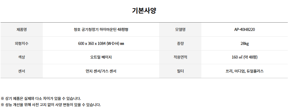 AP-40H8220 청호나이스 [청호나이스] 하이마운틴 언택트 공기청정기 48평형 제품분류 청정기 AS기간 렌탈기간내 최저 렌탈가 월 41,900 (렌탈가) 제휴카드 할인가 월 (렌탈가) 3년 5년 방문관리/4개월 방문관리/2개월 할인 제휴카드 보기 렌탈신청 장바구니